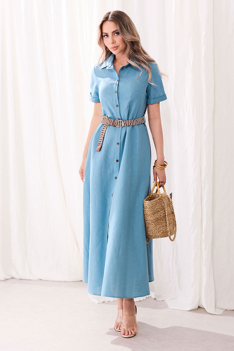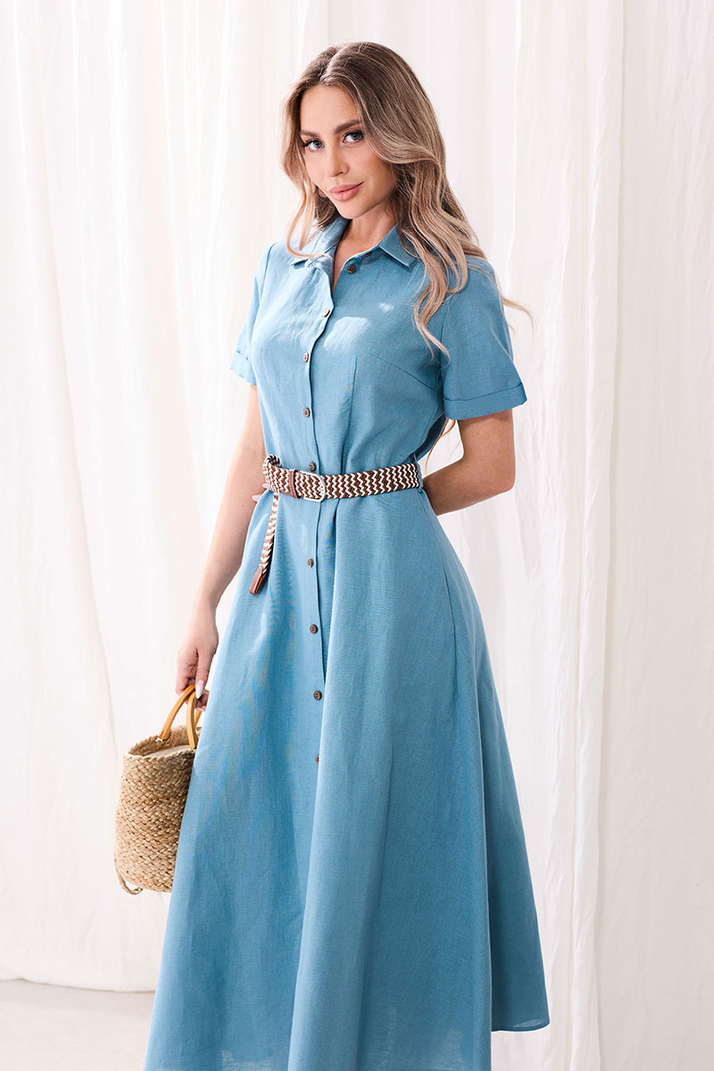 Платье с центральной застежкой на петли и пуговицы, с втачным воротником с отрезной стойкой. Платье отрезное по линии талии. По лифу переда, нагрудные и талиевые вытачки. Лиф спинки с талиевыми вытачками. Рукав втачной, короткий. В боковых швах расположены карманы. Платье со съемным поясом.