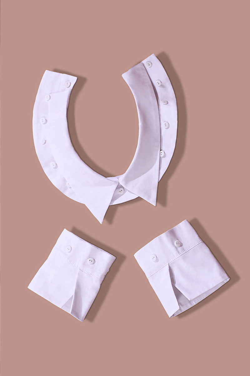 Платье с застежкой на потайную молнию в среднем шве спинки, с круглым вырезом горловины,со съемным воротником. По переду с рельефами, выходящими из проймы. Платье отрезное по линии талии. Нижняя часть переда и спинки расширенная к низу. По нижней части переда два рельефа, левый рельеф заканчивается разрезом. Нижняя часть спинки со средним швом, двумя рельефами. Рукав втачной, длинный, со съемными манжетами. Силуэт: полуприлегающий