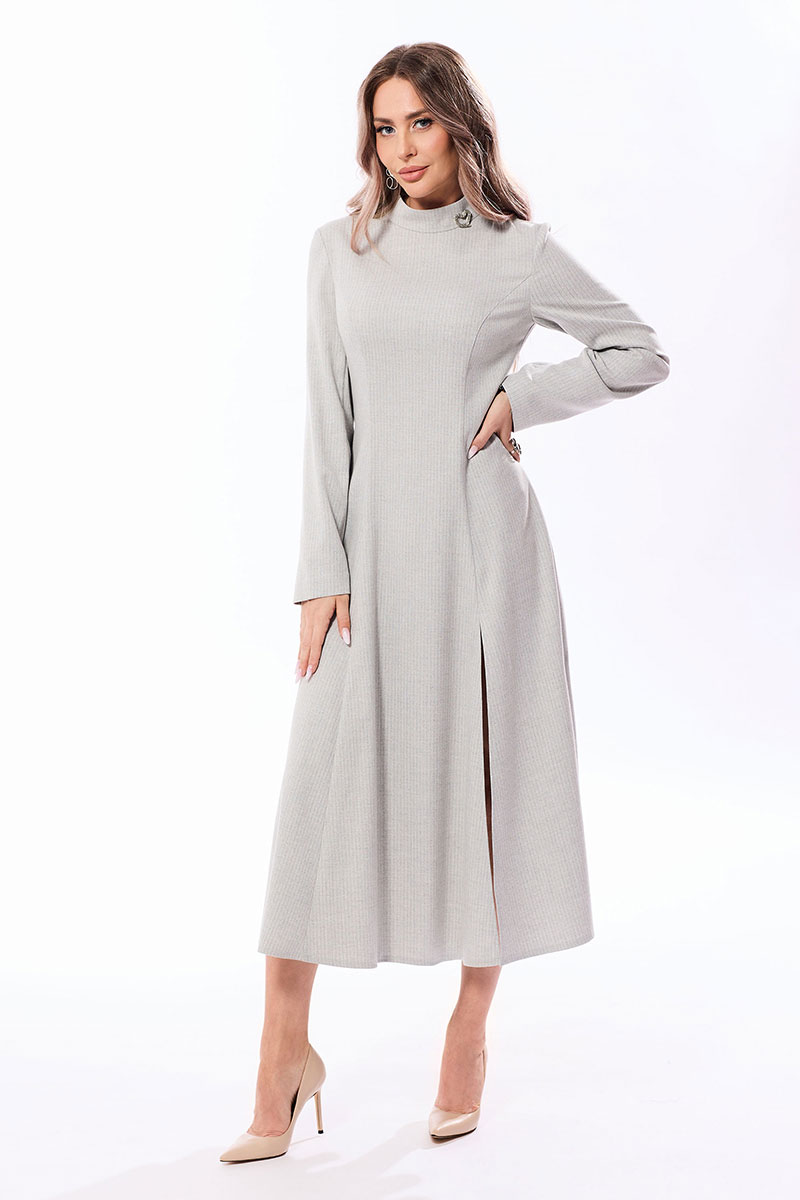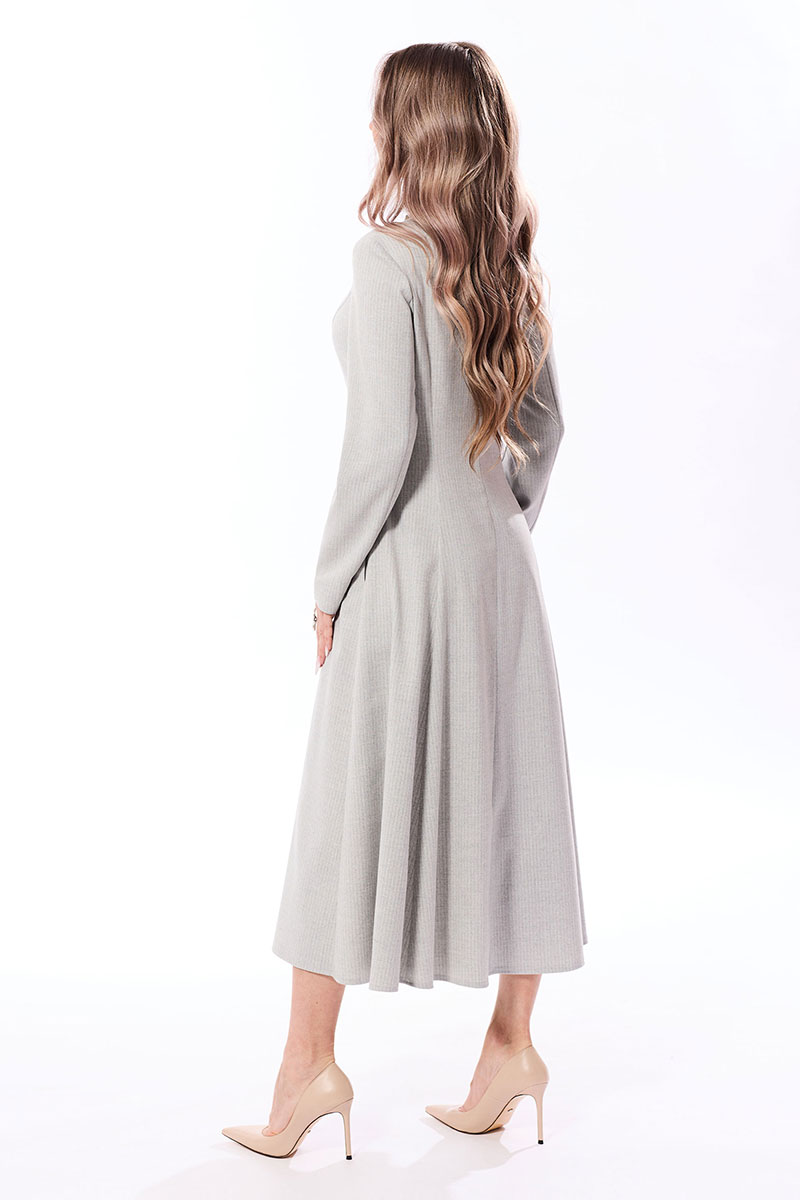 Платье с отрезным воротником- стойкой, застегивающейся по спинке на две петли и пуговицы, застежкой на потайную молнию по среднему шву спинки. По переду с рельефами, выходящими из проймы. Левый рельефный шов заканчивается разрезом. Спинка со средним швом, с рельефами, выходящими из проймы. Рукав втачной, длинный. В боковых швах расположены карманы.