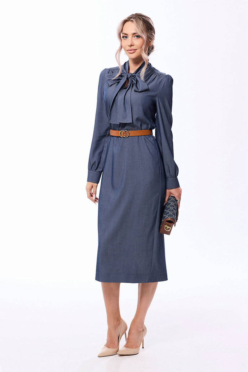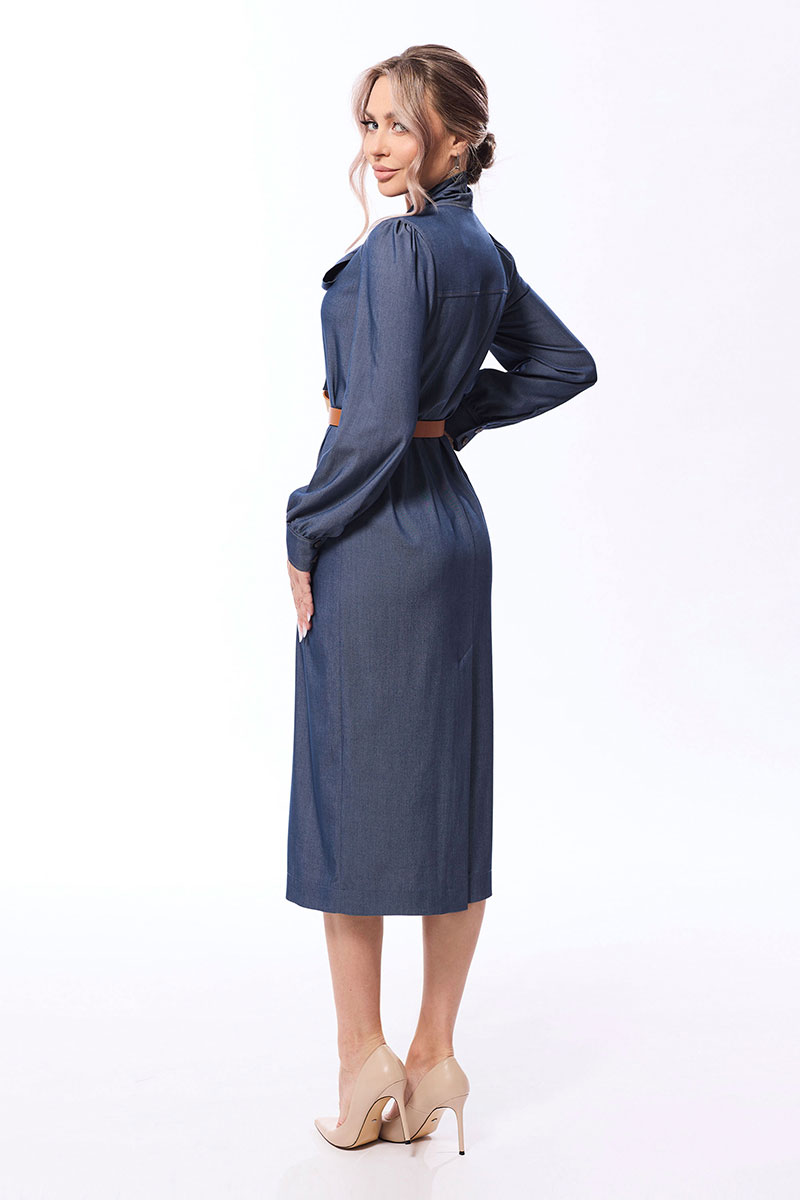 Платье с отрезным воротником- стойкой переходящей в бант- завязку, фигурным вырезом по горловине переда. Платье с отрезной кокеткой, переходящей на перед. По шву притачивания кокетки по полочке и спинке- сборка. Рукав втачной, длинный, с отрезной манжетой. Окат рукава и шов притачивания манжеты со сборкой. Платье со съемным поясом. На боковых швах расположены шлевки для пояса.
