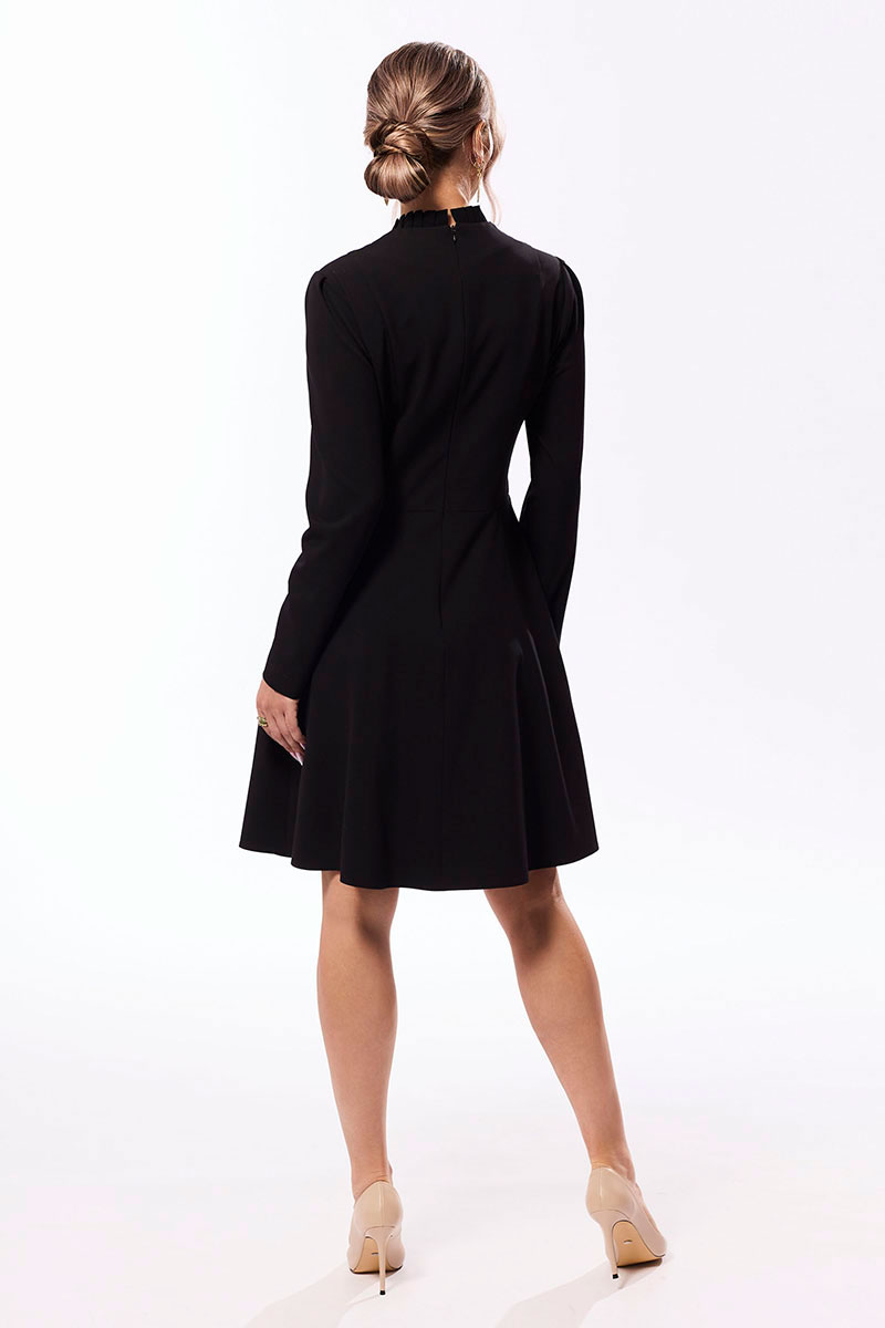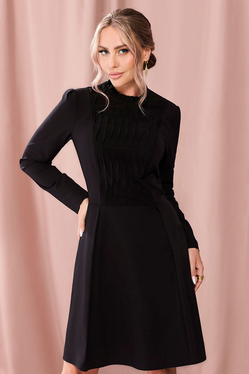 Платье полуприлегающего силуэта, с застежкой на потайную молнию в среднем шве спинки, с отрезным воротником- стойкой, заложенным в односторонние складки. Платье отрезное по линии талии. Верхняя часть переда с рельефами, выходящими из плеча. Центральная часть переда с декоративными защипами .Спинка со средним швом, рельефами, выходящими из плеча. Рукав втачной, длинный. Нижняя часть платья расширенная к низу