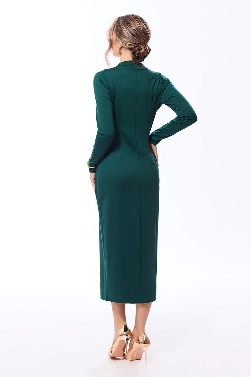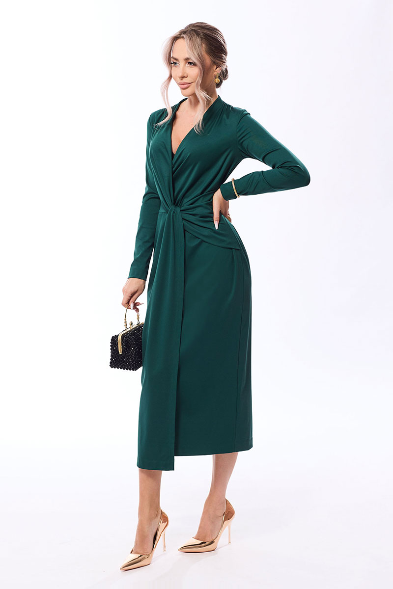 Платье, без воротника, с V-образным вырезом горловины. По плечевым швам переда- сборка. Платье по переду отрезное по линии талии. По талии переда с декоративным узлом, спинка со средним швом, талиевыми вытачками. Рукав втачной, длинный.