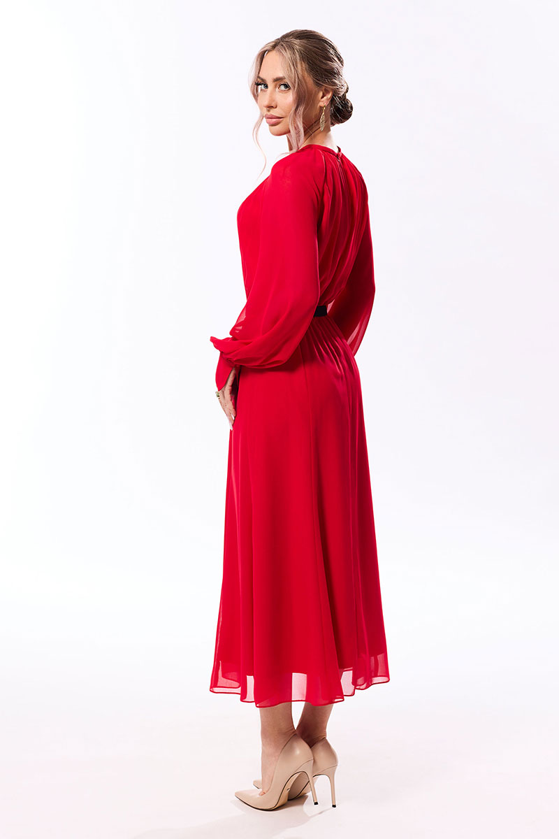 Платье без воротника, с круглым вырезом горловины, с застежкой на потайную молнию в среднем шве спинки. Платье, отрезное по линии талии, присборено на резинку. По лифу переда со сборкой по горловине. Спинка со средним швом. Нижняя часть платья расширена к низу по типу «годэ». Рукав реглан, длинный, с отрезной манжетой. Шов притачивания манжеты присборен.