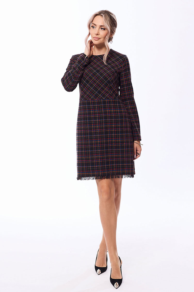 Платье с застежкой на потайную молнию в среднем шве спинки, без воротника, с круглым вырезом горловины, По переду с талиевыми вытачками. Платье отрезное по линии талии. Нижняя часть переда и спинки расширенная к низу. Спинка со средним швом. Рукав втачной, длинный. По низу платья- бахрома из основной ткани