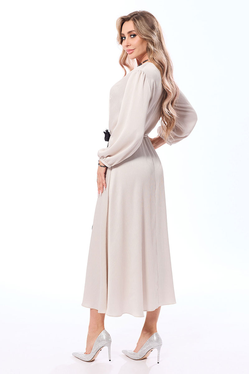Платье, без воротника, без застежки, отрезное по линии талии. Лиф переда с запахом. Талия собрана на резинку. Верхняя часть спинки с талиевыми вытачками. Нижняя часть платья расширена к низу. Рукав втачной, 3/4, с манжетой, присборенной на резинку. Платье со съемным декоративны поясом из основной ткани и декоративным цветком на поясе.