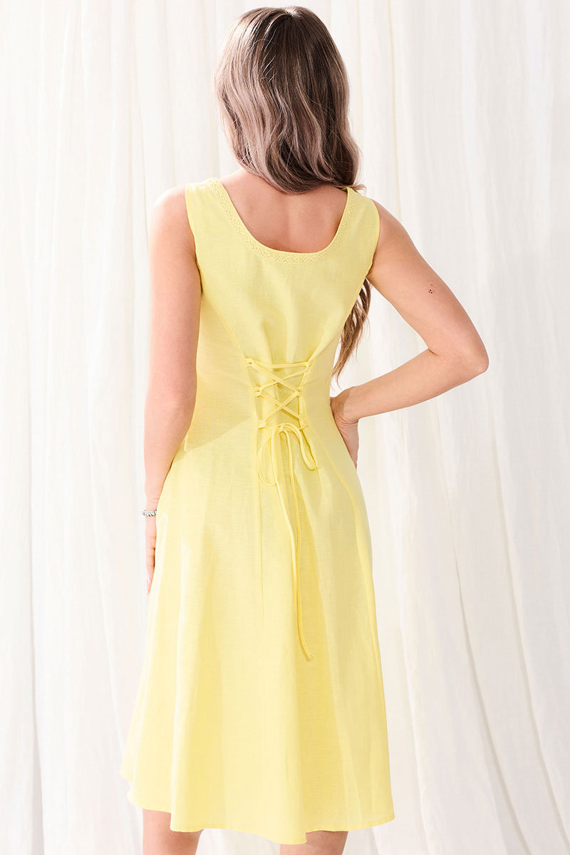 Платье, без воротника, без рукавов, с круглым вырезом горловины, центральной застежкой на навесные петли и пуговицы. По переду с рельефами, выходящими из проймы. Горловина переда и спинки, верхняя часть рельефов переда, талия переда декорирована кружевом в тон основной ткани. Спинка с рельефами, выходящими из проймы. По центральной части спинки на уровне талии навесные петли со шнуровкой.