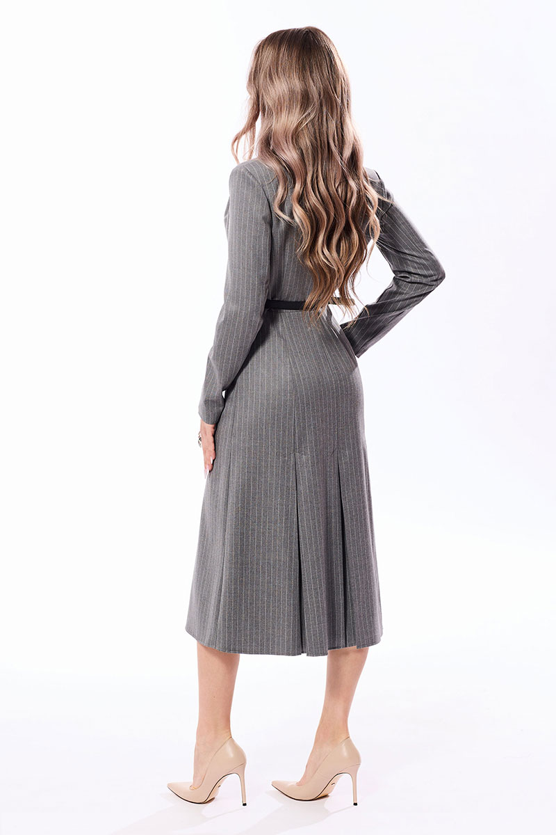 Платье с втачным воротником и лацканами пиджачного типа, с центральной двубортной застежкой на петли и пуговицы по лифу переда и застежкой на потайную молнию по левому боковому шву. Платье отрезное по линии талии. По лифу переда с рельефами, выходящими из проймы. Спинка со средним швом, по лифу спинки с талиевыми вытачками. Нижняя часть платья расклешенная, с тремя встречными складками по переду и спинке. Рукав втачной, длинный. Платье со съемным поясом, на боковых швах расположены шлевки для пояса.