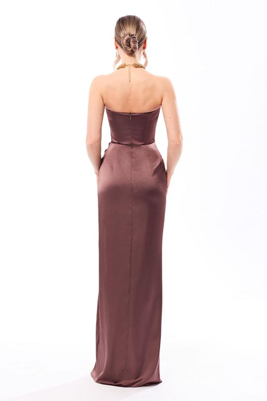 Платье полуприлегающего силуэта, с застежкой на потайную молнию в среднем шве спинки, без воротника, без рукавов, отрезное по линии талии . Лиф переда и спинки с рельефами от верхнего края до талиевого шва, . Спинка со средним швом. Рельефные швы лифа усилены регилином .Нижняя часть переда с двумя асимметричными деталями. Верхняя деталь с четырьмя односторонними складками, выходящими из бокового шва .