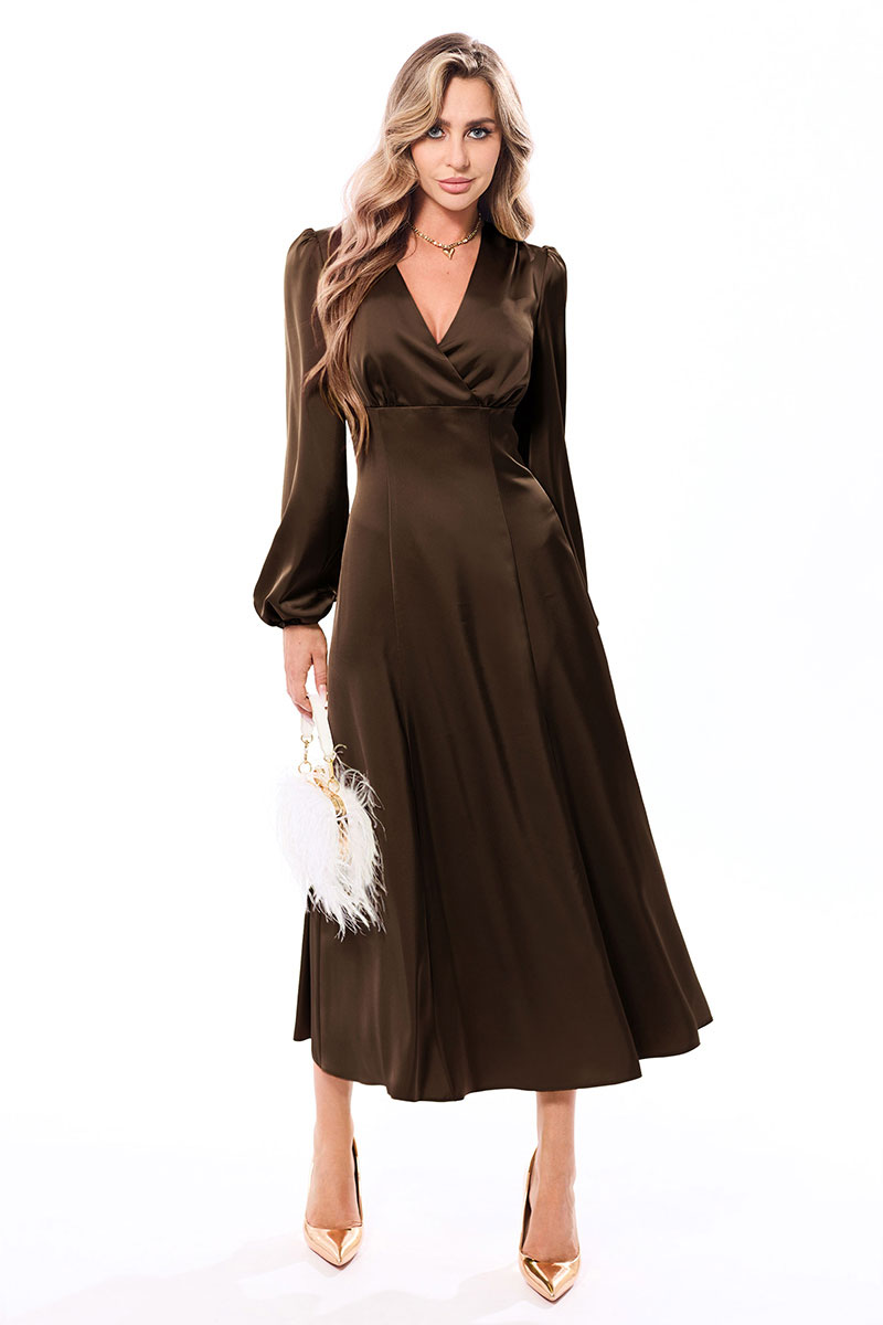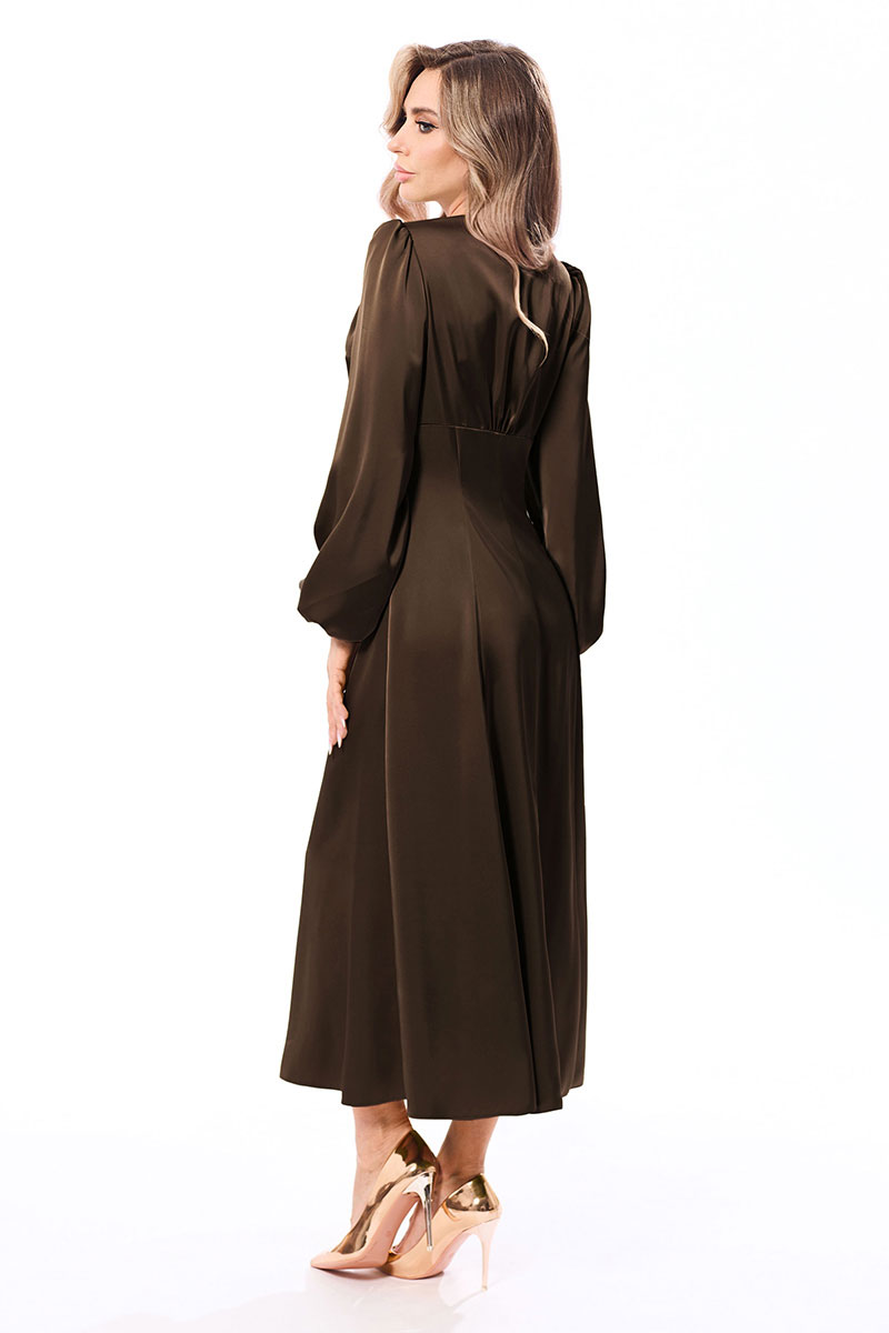 Платье, без воротника, с V-образным вырезом горловины, застежкой на потайную молнию в левом боковом шве. Платье отрезное по линии талии. Лиф переда с деталями на запах, со сборкой по плечевым и нижнему швам. Лиф спинки с частичной сборкой по низу. Рукав длинный, втачной, с отрезной манжетой, присборенной на резинку. Окат рукава со сборкой. Нижняя часть платья с двумя рельефными швами. Нижняя часть спинки со средним швом, двумя рельефными швами.
