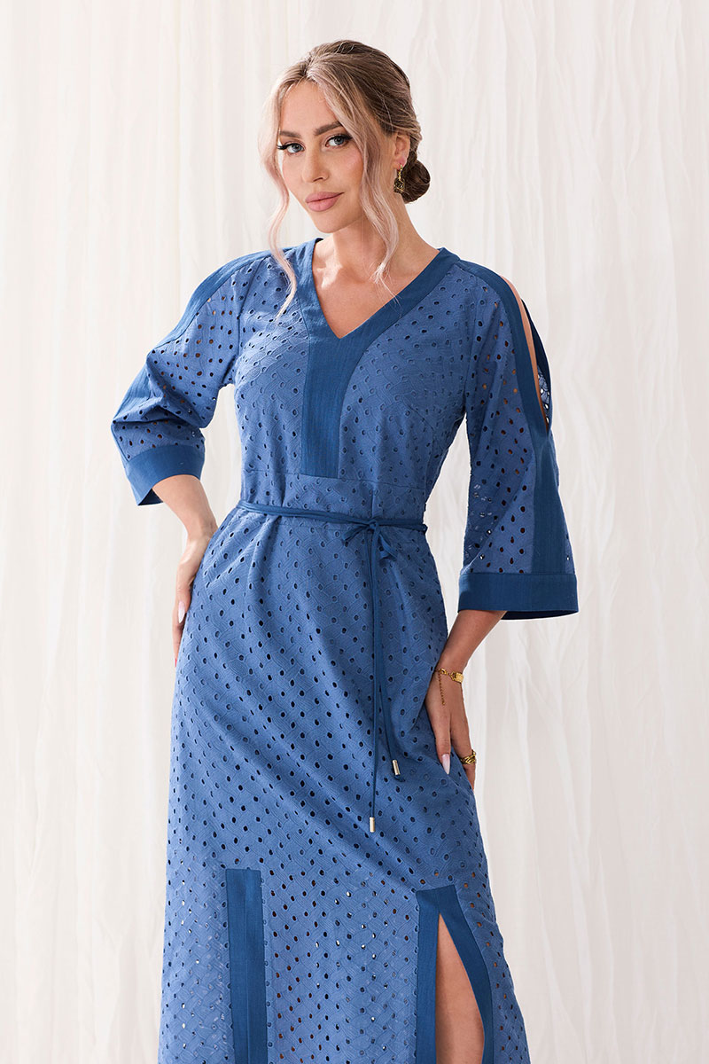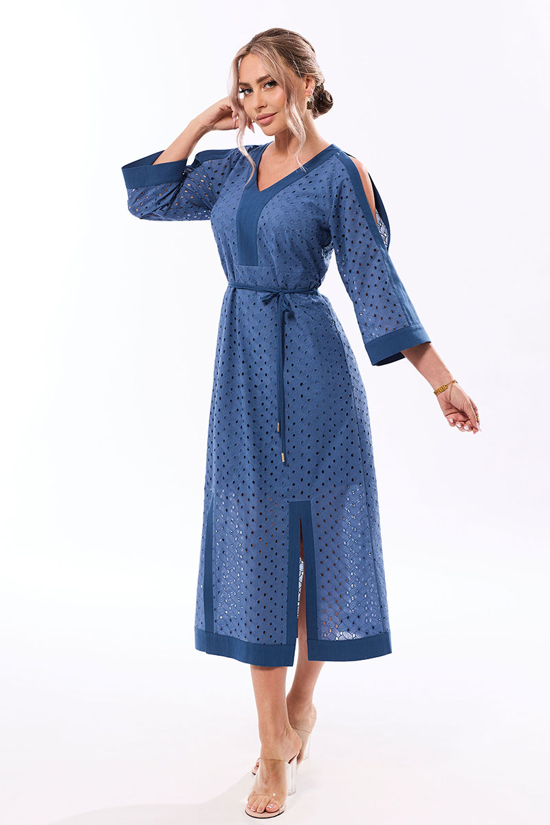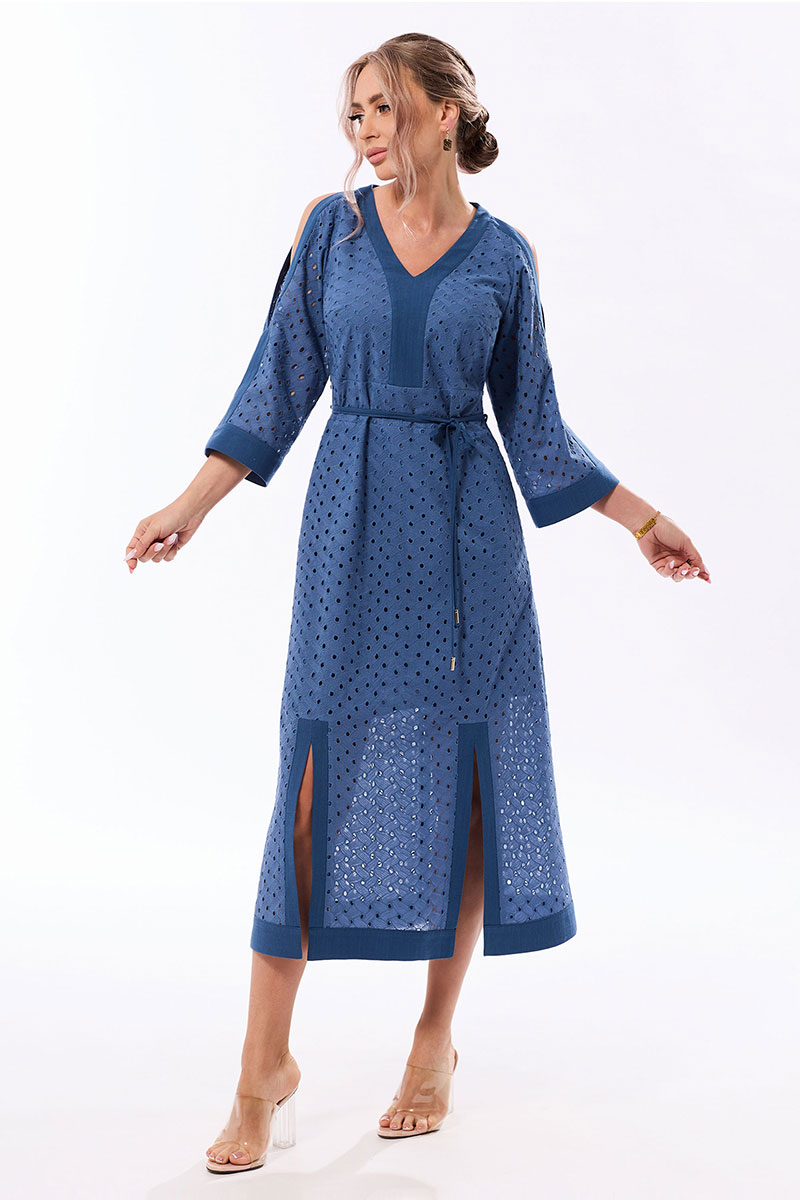 Платье, ,без воротника, с V-образным вырезом горловины, застежкой на потайную молнию в среднем шве спинки. Платье отрезное по линии талии. Лиф переда с нагрудными вытачками ,отделочной планкой по горловине и центру переда . По талии переда и спинки- втачной пояс. По боковым швам расположены навесные петли для пояса- шнуровки. Нижняя часть платья- расклешенная, по переду два разреза с втачными планками. Рукав полуреглан, с манжетой, отделочными планками по верхней части рукава, разрезами по плечевым швам. Платье со съемным поясом.