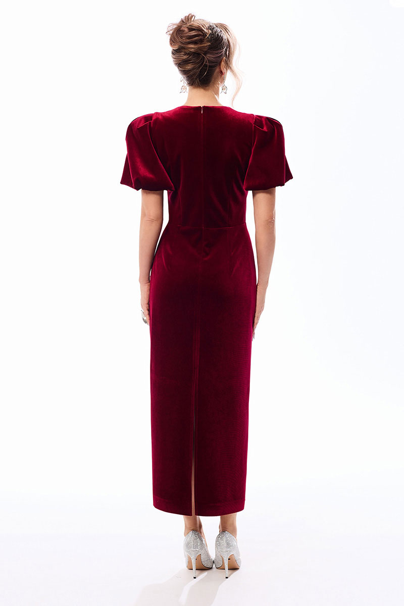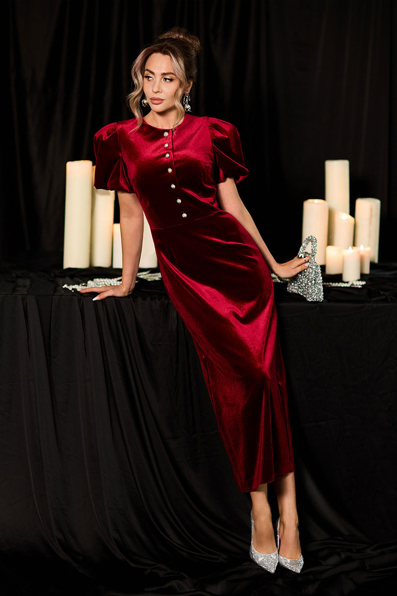 Платье без воротника, с круглым вырезом горловины, центральной застежкой на петли и пуговицы по лифу переда. Платье отрезное по линии талии. По лифу переда с нагрудными вытачками. Спинка со средним швом, заканчивающимся разрезом, талиевыми вытачками. Рукав втачной, короткий, по низу, присборен на резинку. Окат рукава присборен.