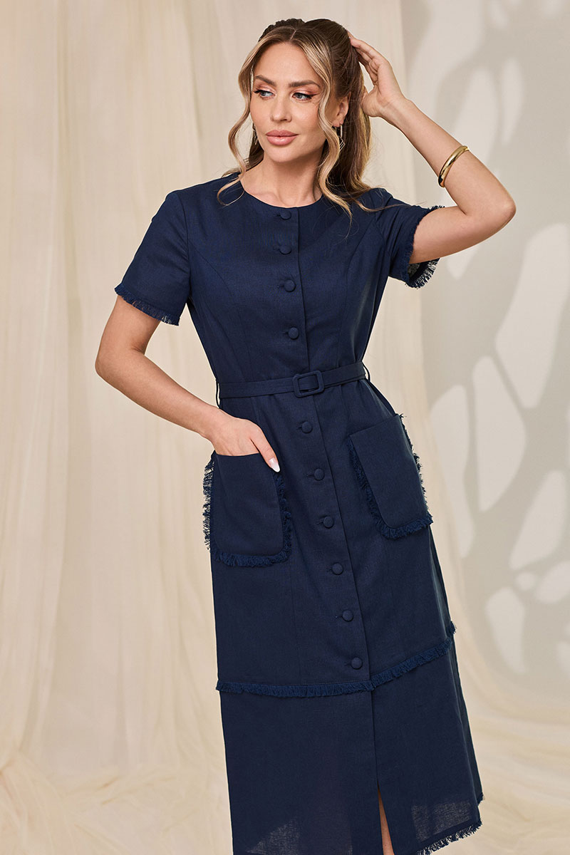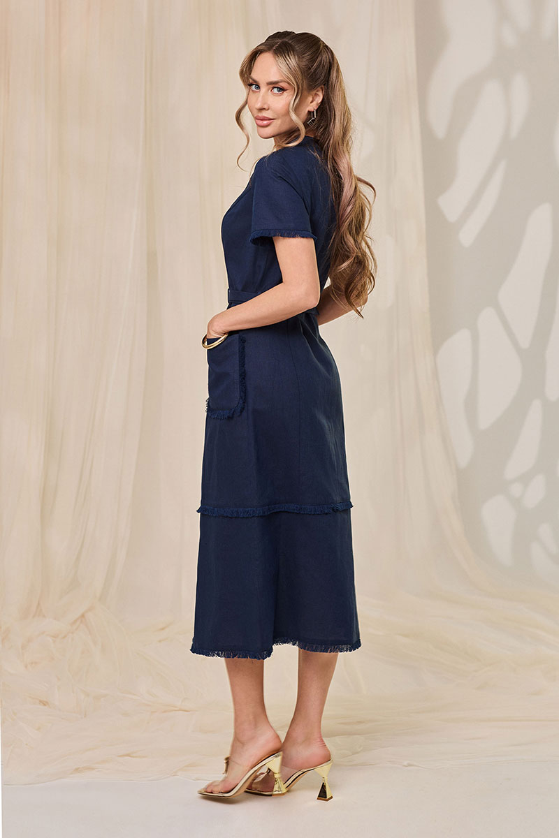 Платье без воротника, с круглым вырезом горловины, центральной застежкой на петли и пуговицы. По переду с рельефами, выходящими из проймы, накладными карманами, расположенными на уровне линии бедер. Спинка со средним швом, рельефами, выходящими из проймы. Низ с отрезной деталью. Рукав втачной, короткий. По низу платья, низу рукавов, карманам и по шву притачивания нижней детали- бахрома из основной ткани. Платье со съемным поясом.