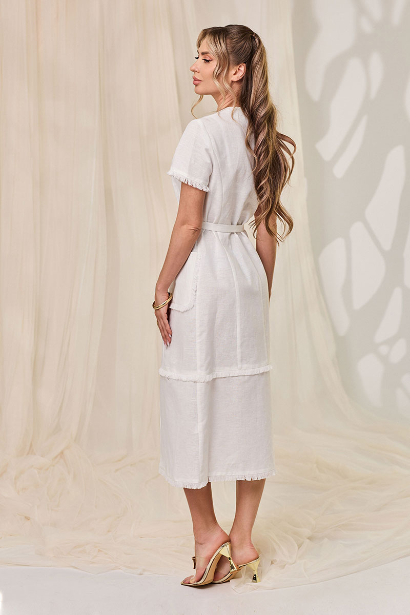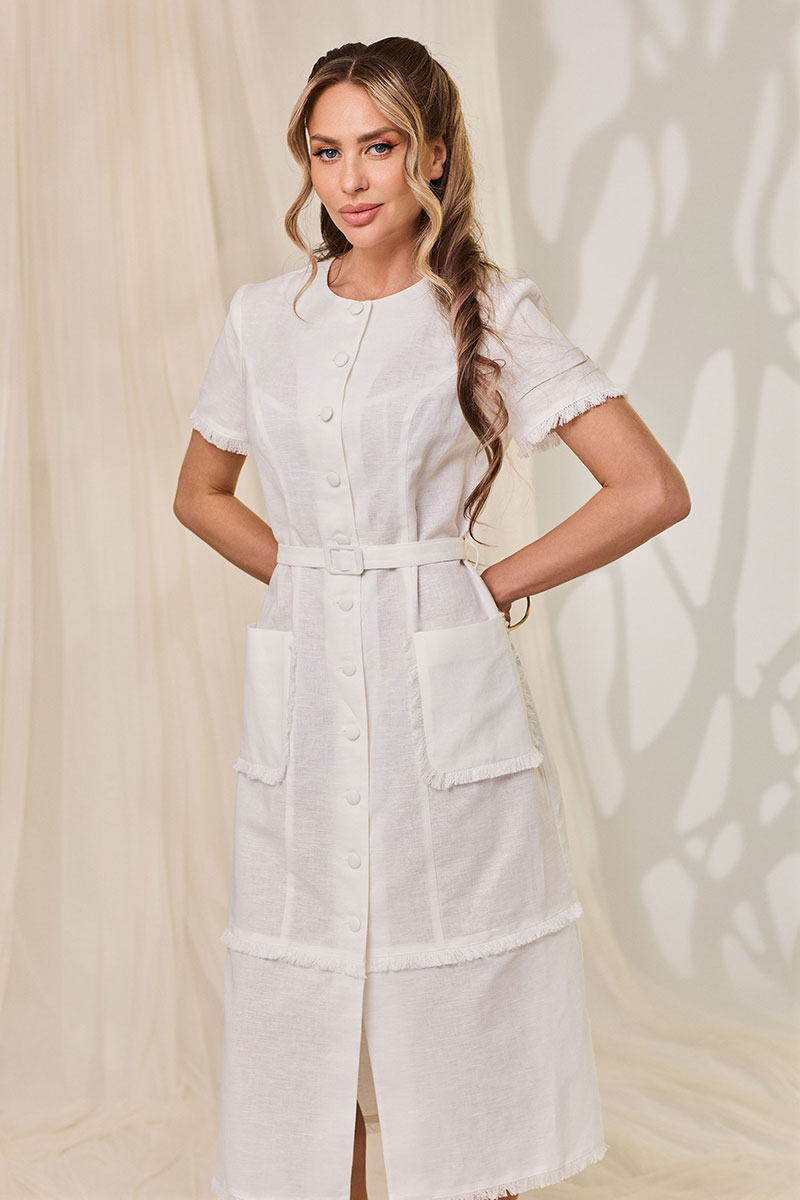 Платье без воротника, с круглым вырезом горловины, центральной застежкой на петли и пуговицы. По переду с рельефами, выходящими из проймы, накладными карманами, расположенными на уровне линии бедер. Спинка со средним швом, рельефами, выходящими из проймы. Низ с отрезной деталью. Рукав втачной, короткий. По низу платья, низу рукавов, карманам и по шву притачивания нижней детали- бахрома из основной ткани. Платье со съемным поясом.