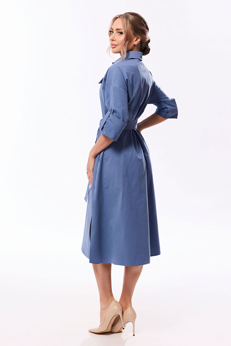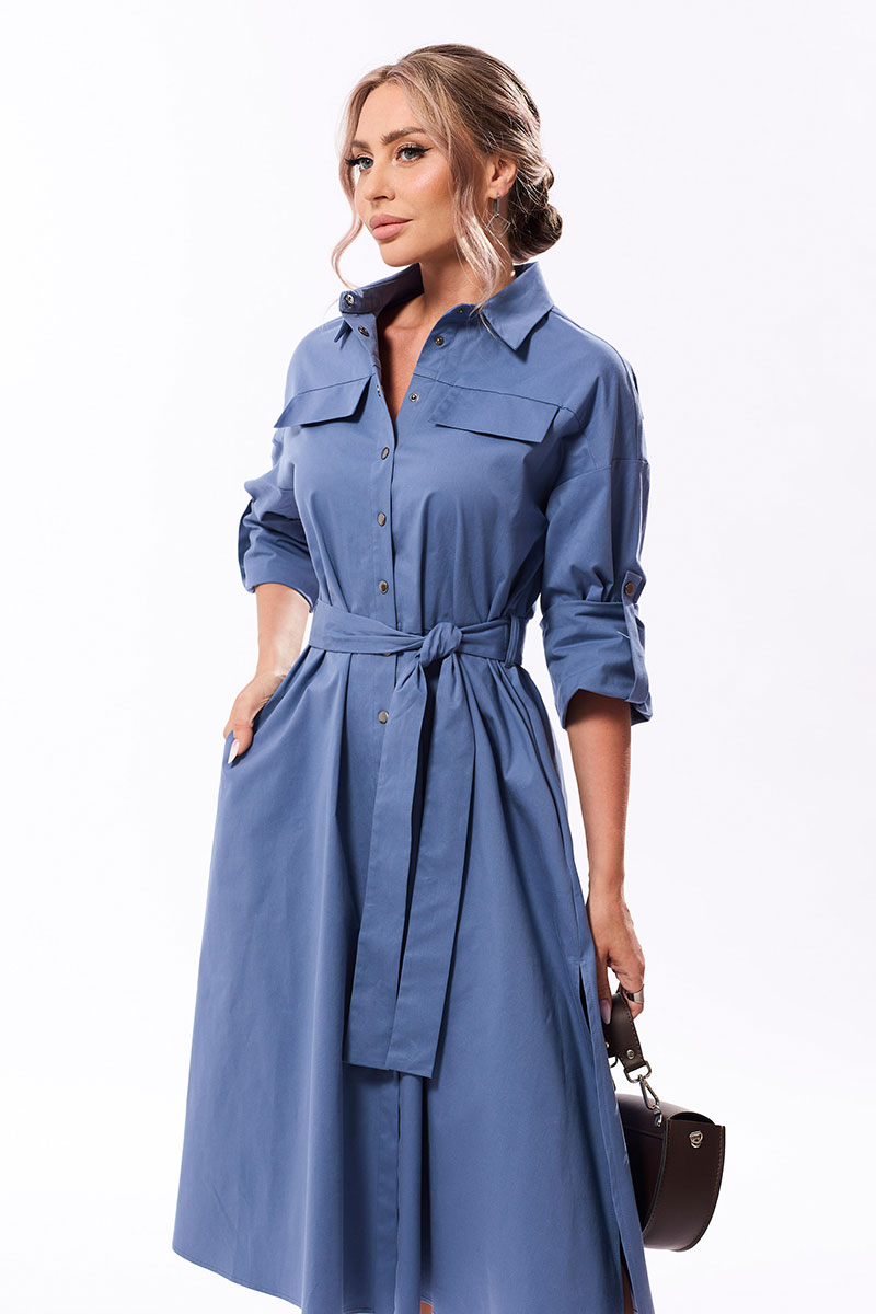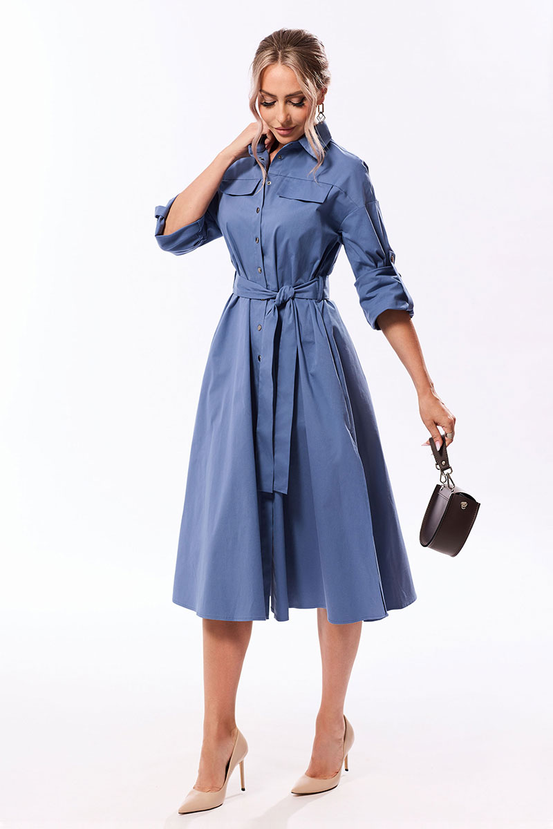 Платье с центральной застежкой на кнопки, втачным воротником с отрезной стойкой. Платье отрезное по линии талии. Лиф переда с кокеткой и клапанами, выходящими из кокетки. Нижняя часть платья расклешенная, с карманами в боковых швах. По низу боковых швов- разрезы. Рукав втачной, длинный, со спущенным плечом. На рукавах расположены паты, которые могут фиксировать отворот рукава кнопкой. Платье со съемным поясом.