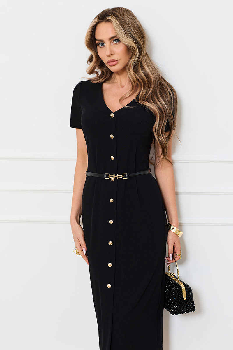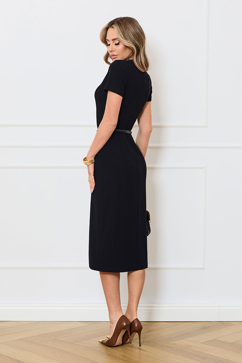 Платье с центральной застежкой на петли и пуговицы, без воротника, с V-образным вырезом горловины. По переду с нагрудными вытачками. Спинка со средним швом, талиевыми вытачками. Рукав втачной, короткий. Платье со съемным поясом.