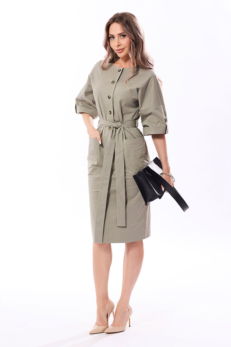 Платье с центральной застежкой на петли и пуговицы, без воротника, с круглым вырезом горловины. По переду, на уровне линии бедер расположены накладные карманы фигурной формы. Спинка со средним швом, заканчивающимся разрезом. Рукав втачной, со спущенным плечом. По низу рукава пата, закрепленная к рукаву петлей и пуговицей. Платье со съемным поясом. По боковым швам расположены шлевки для съемного пояса.