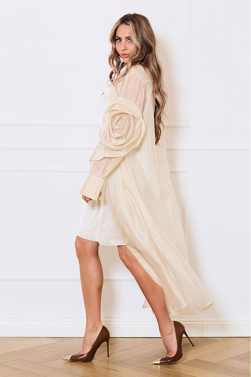 Платье с центральной застежкой на петли и пуговицы, втачным воротником с отрезной стойкой. По переду с клапанами, расположенными на уровне груди. Спинка с отрезной кокеткой. По шву притачивания кокетки- встречная складка. По боковым швам- разрезы. Рукав втачной, длинный, с отрезной манжетой. По левому рукаву отделка- декор в виде розы. Платье двойное. Нижнее платье на бретелях, с нагрудными вытачками по переду.