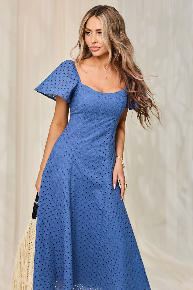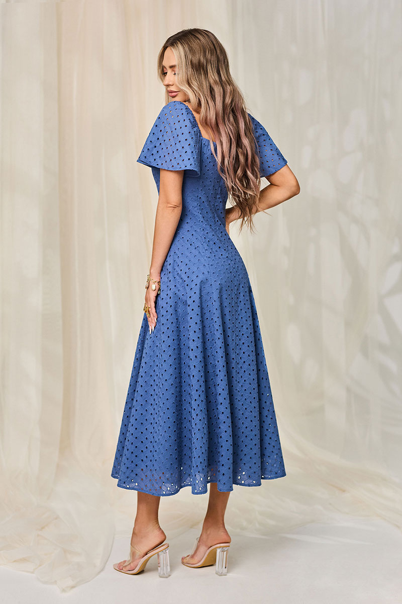 Платье с центральной застежкой на потайную молнию в среднем шве спинки, без воротника, с фигурным вырезом горловины. По переду с рельефами, выходящими из горловины до низа. Рельефы переда с фигурным подрезом по линии талии. Спинка со средним швом, рельефами, выходящими из горловины до низа. Рукав втачной, короткий, крылышко. Горловина спинки и окат рукава присборен на резинку.