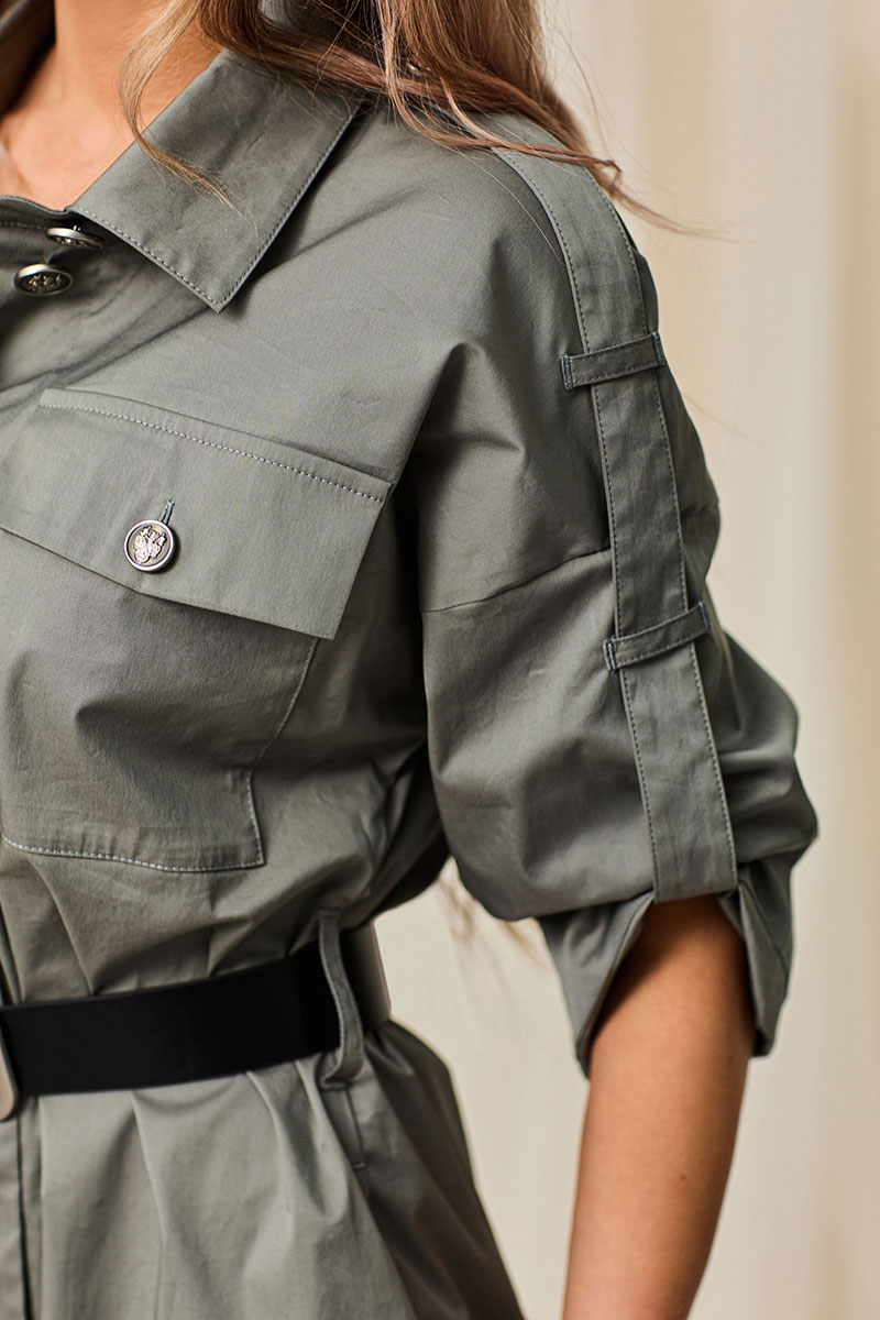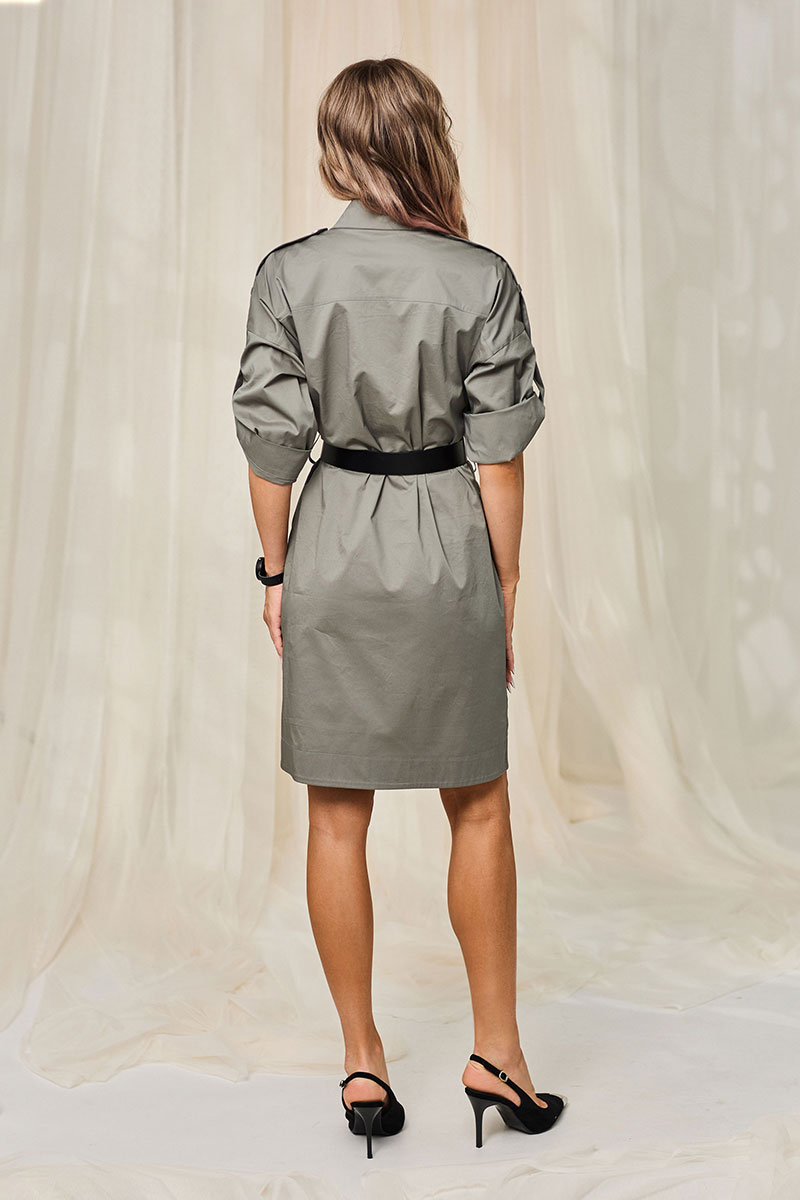 Платье с центральной застежкой, втачным воротником. По полочкам- на уровне линии груди расположены накладные карманы с клапаном. Спинка с отрезной кокеткой. Плечо спущенное, рукав втачной, 3/4. На плечевых швах расположены шлевки и пата, закрепленная петлей и пуговицей. Платье со съемным поясом. На боковых швах расположены шлевки для пояса.