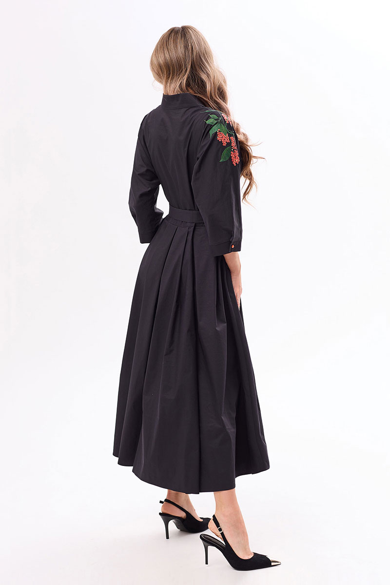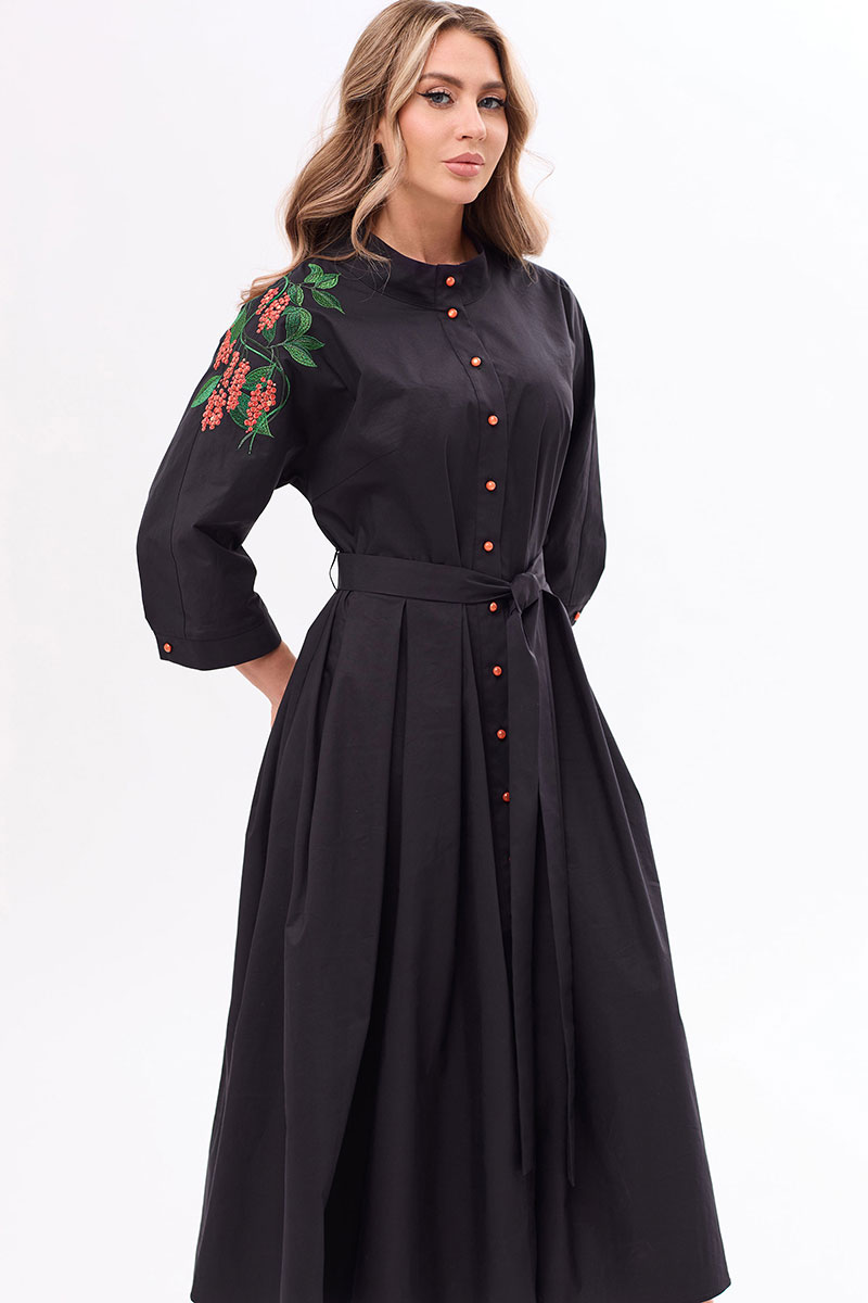 Платье с центральной застежкой на петли и пуговицы, расположенные по планке полочек, втачным воротником- стойкой. Платье отрезное по линии талии. По лифу переда- нагрудные вытачки. Нижняя часть платья- расширенная, с бантовыми складками. Рукав цельнокроенный, ¾, с отрезной манжетой. На плечевых швах расположены шлевки и пата, закрепленная петлей и пуговицей. Платье со съемным поясом. В боковых швах расположены карманы.