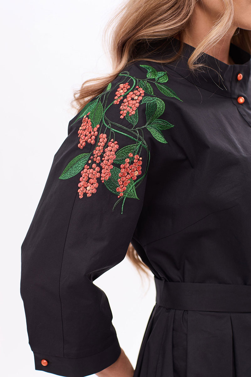 Цветовая гамма для верха, подкладки, фурнитуры, отделки: платье из ткани в одной цветовой гамме.Правый рукав и полочка декорированы вышивкой.