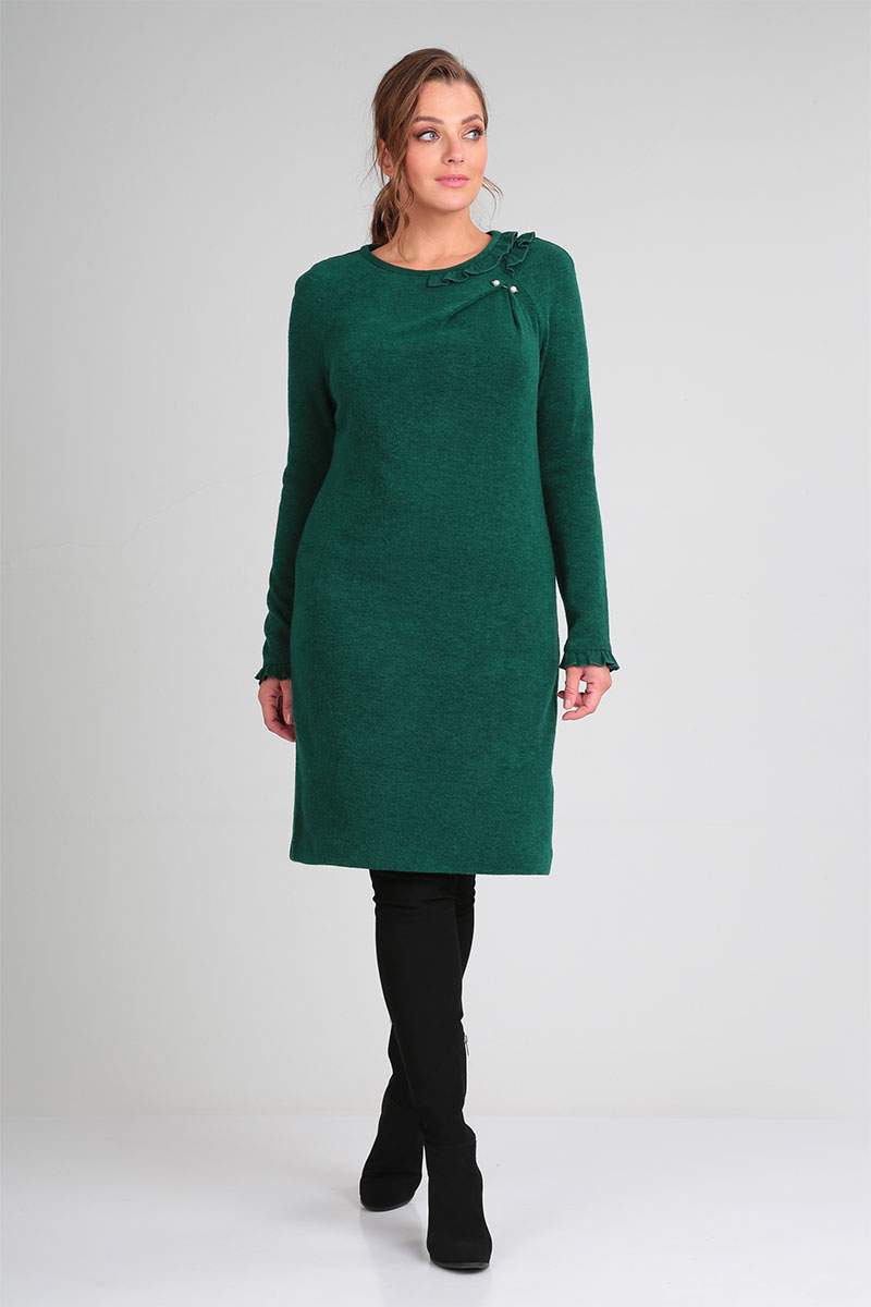 Цветовая гамма для верха, подкладки, фурнитуры, отделки: платье из эластичной ткани, в одной цветовой гамме. Платье декорировано брошью.