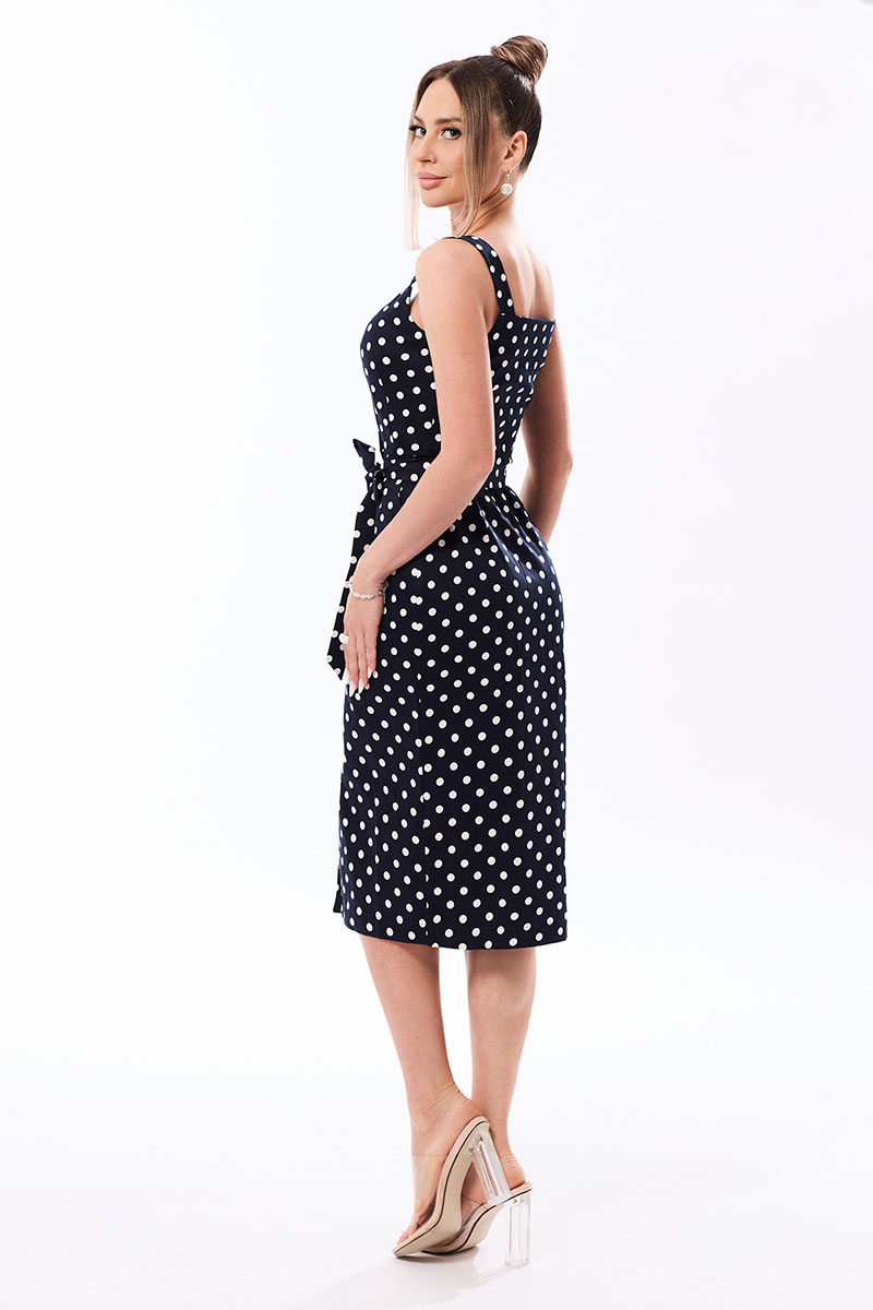 Платье с центральной застежкой на петли и пуговицы, на широких бретелях. Платье отрезное по линии талии. Верхняя часть переда с талиевыми вытачками, нижняя часть переда с карманами и односторонними складками по талии. Нижняя деталь спинки с талиевыми вытачками. Платье со съемным поясом.