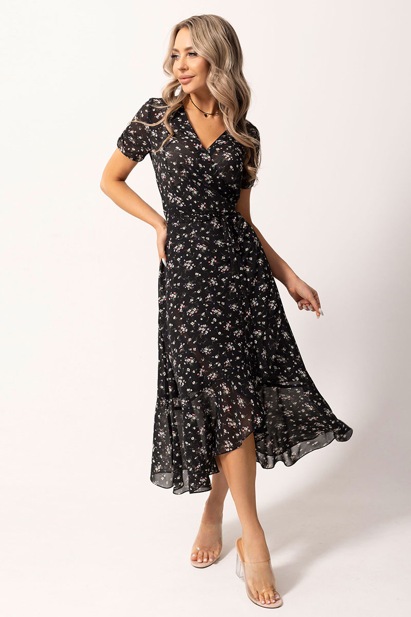Платье отрезное по линии талии, без воротника,с V-образным вырезом горловины. Платье на запах, с поясом- завязкой, фиксацией на пришивную кнопку по горловине переда. Верхняя часть переда с рельефами, выходящими из проймы. Верхняя часть спинки со средним швом, талиевыми вытачками. Рукав со средним швом. Средний шов рукава присборен с помощью резинки.