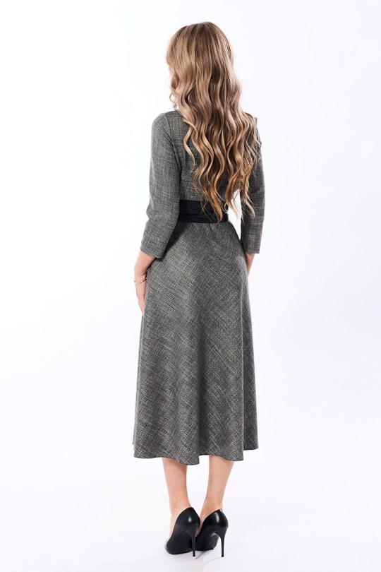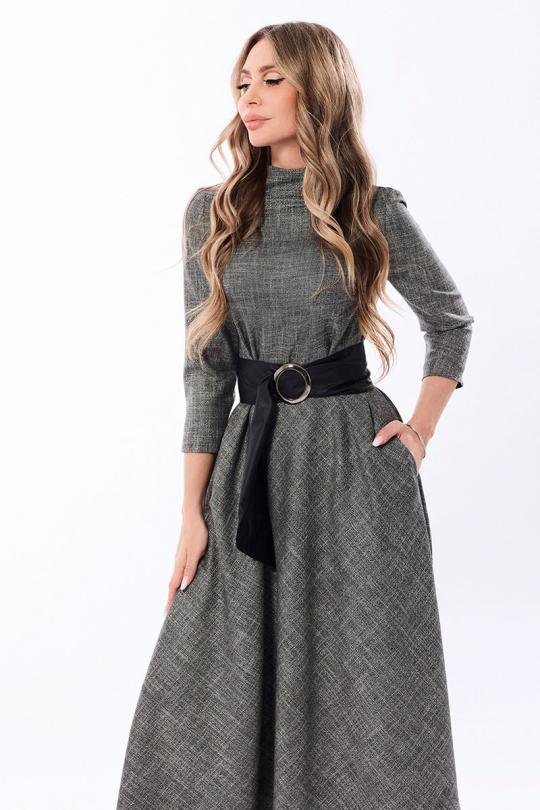 Платье с центральной застежкой на потайную молнию в среднем шве спинки, цельнокроенной стойкой с вытачками. Платье отрезное по линии талии. Верхняя часть переда с нагрудными вытачками. Верхняя часть спинки со средним швом. В боковых швах расположены карманы. Платье со съемным поясом.