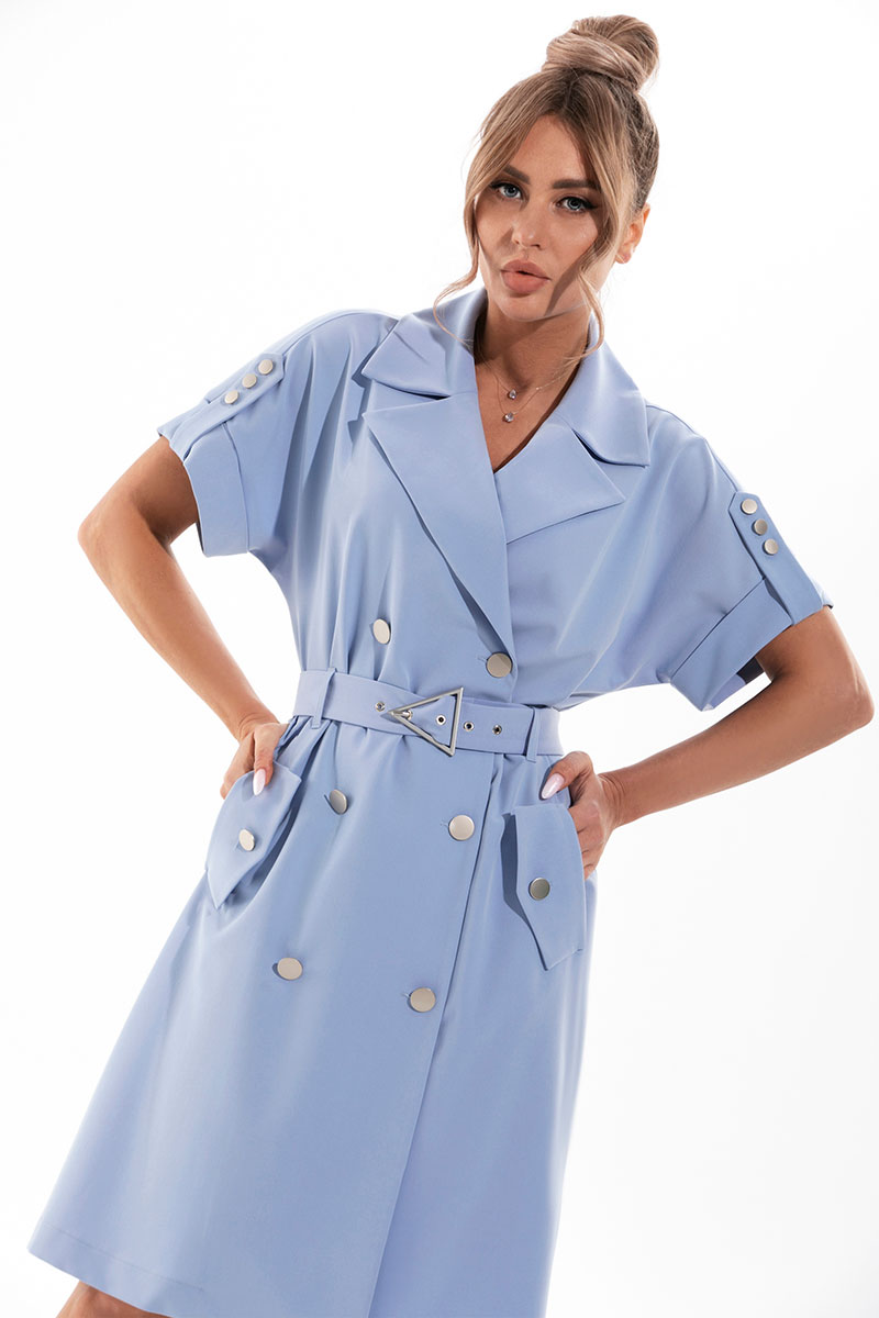 Платье с центральной двубортной застежкой на петли и пуговицы, втачным воротником и отложными лацканами. На уровне линии бедер прорезные карманы с клапанами, зафиксированные к платью петлей и пуговицей. Рукав цельнокроенный, с притачной манжетой и патой, зафиксированной к плечевому шву петлями и пуговицами. Платье со съемным поясом.