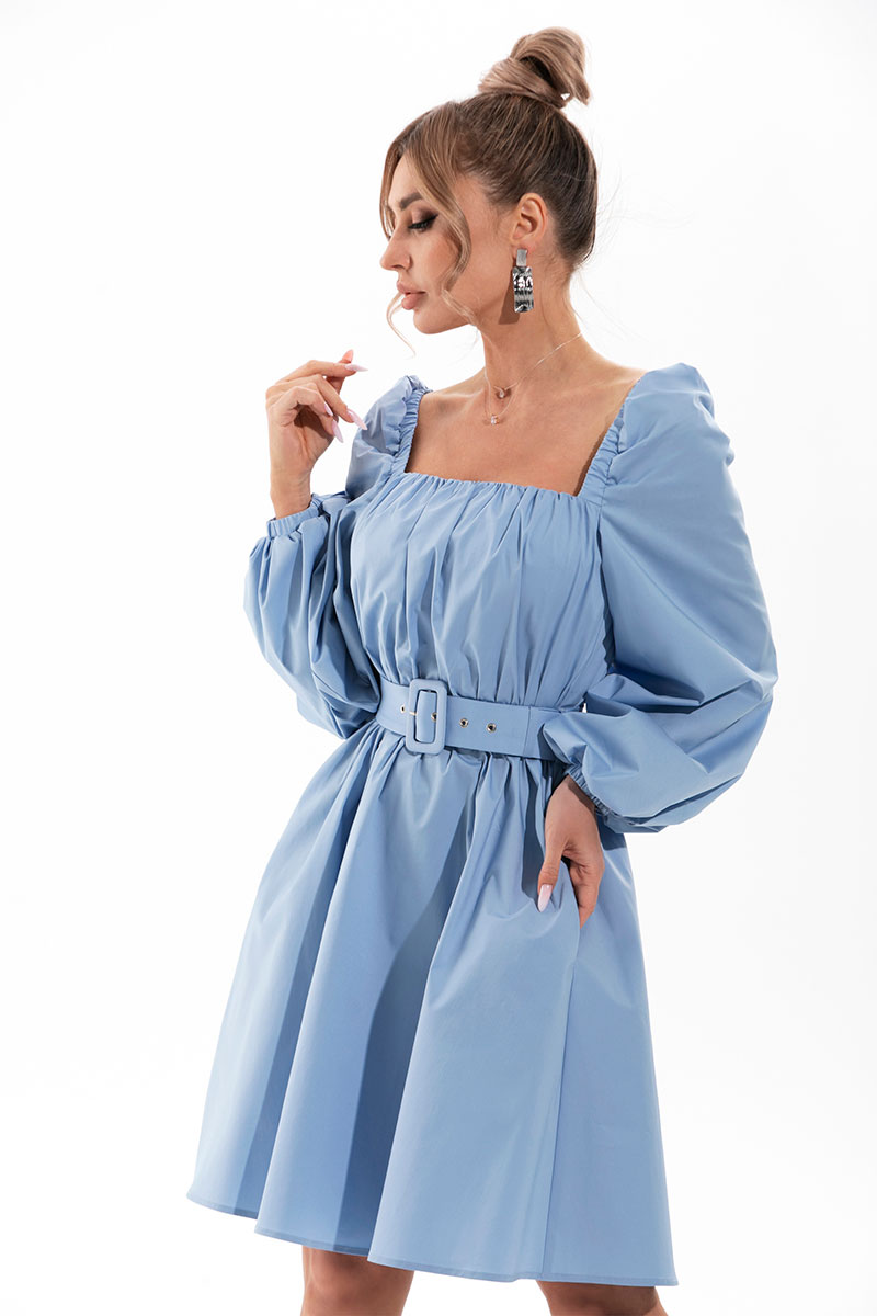 Платье без воротника, с фигурным вырезом горловины, застежкой на потайную молнию в среднем шве спинки. Платье отрезное по линии талии, шов по талии присборен на резинку. По окату рукава притачная планка, присборенная на резинку. Рукав втачной, длинный, с отрезной манжетой.По шву притачивания манжети - сборка. Окат рукава присборен. Горловина переда и спинки присборена. Платье со съемным поясом. В боковых швах- карманы.
