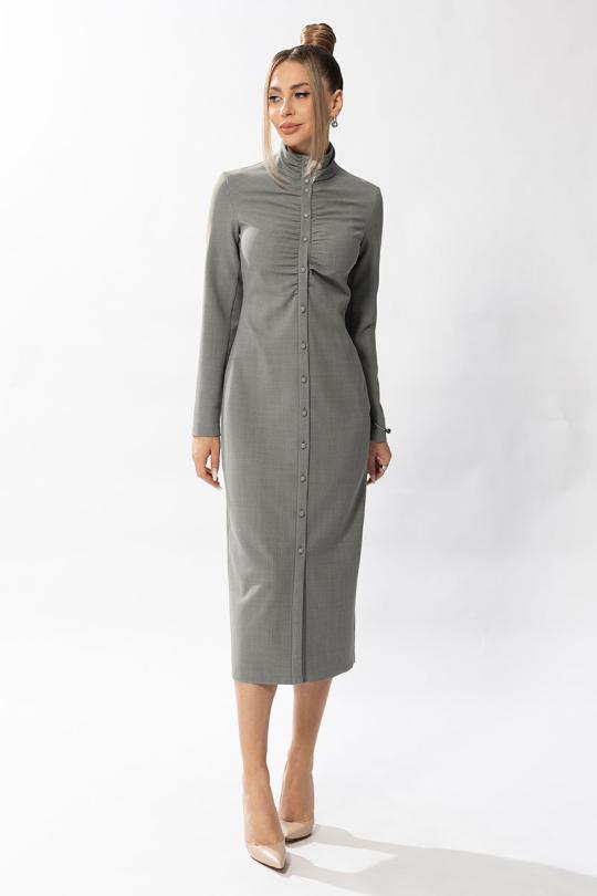 Платье, с центральной застежкой на петли и пуговицы, отрезной стойкой. Полочки и стойка присборены по шву притачивания к планке. Спинка со средним швом и талиевыми вытачками. Рукав втачной, длинный.