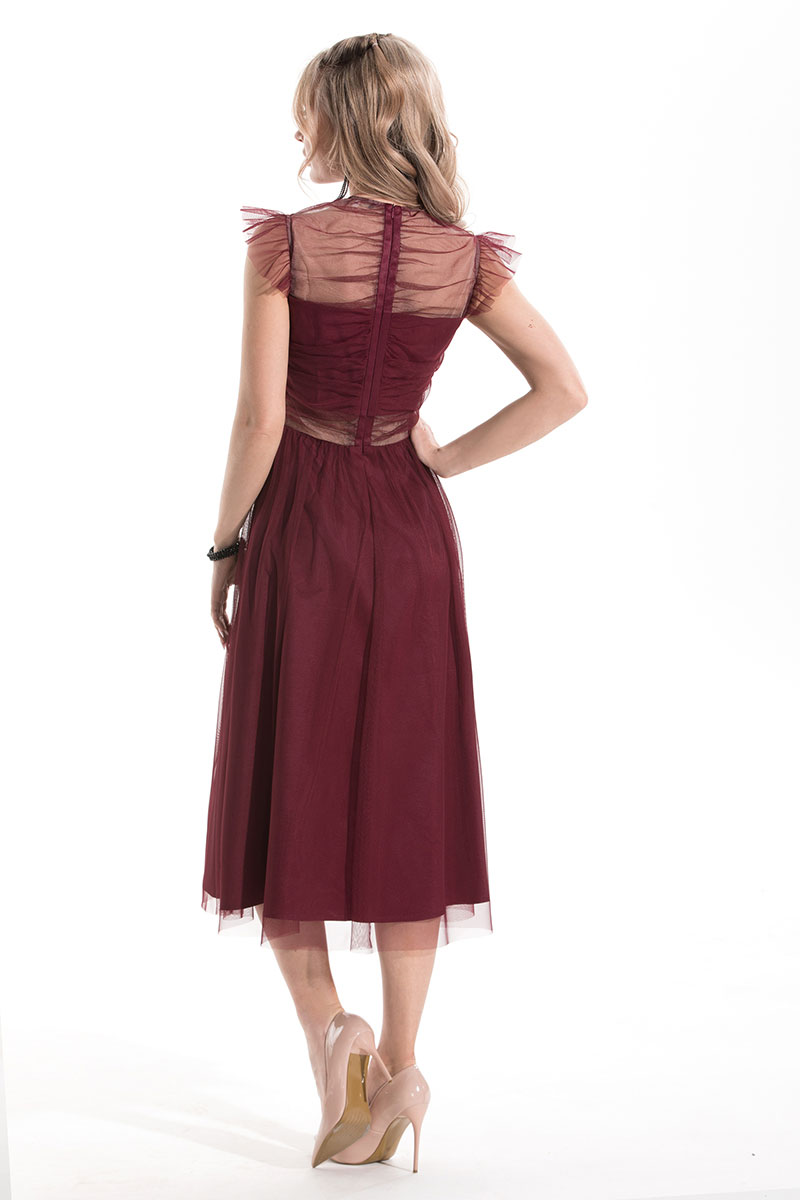 Платье, с застежкой на потайную молнию в среднем шве спинки, без воротника, с круглым вырезом горловины. Отрезное по линии талии. Платье двуслойное. Лиф переда со средним швом. Боковые швы и средний шов переда присборены. Лиф спинки со средним швом, планкой по среднему шву. Юбка по талиевому шву присборена. Рукав-крылышко.