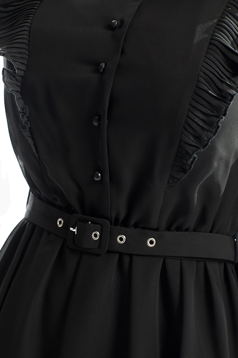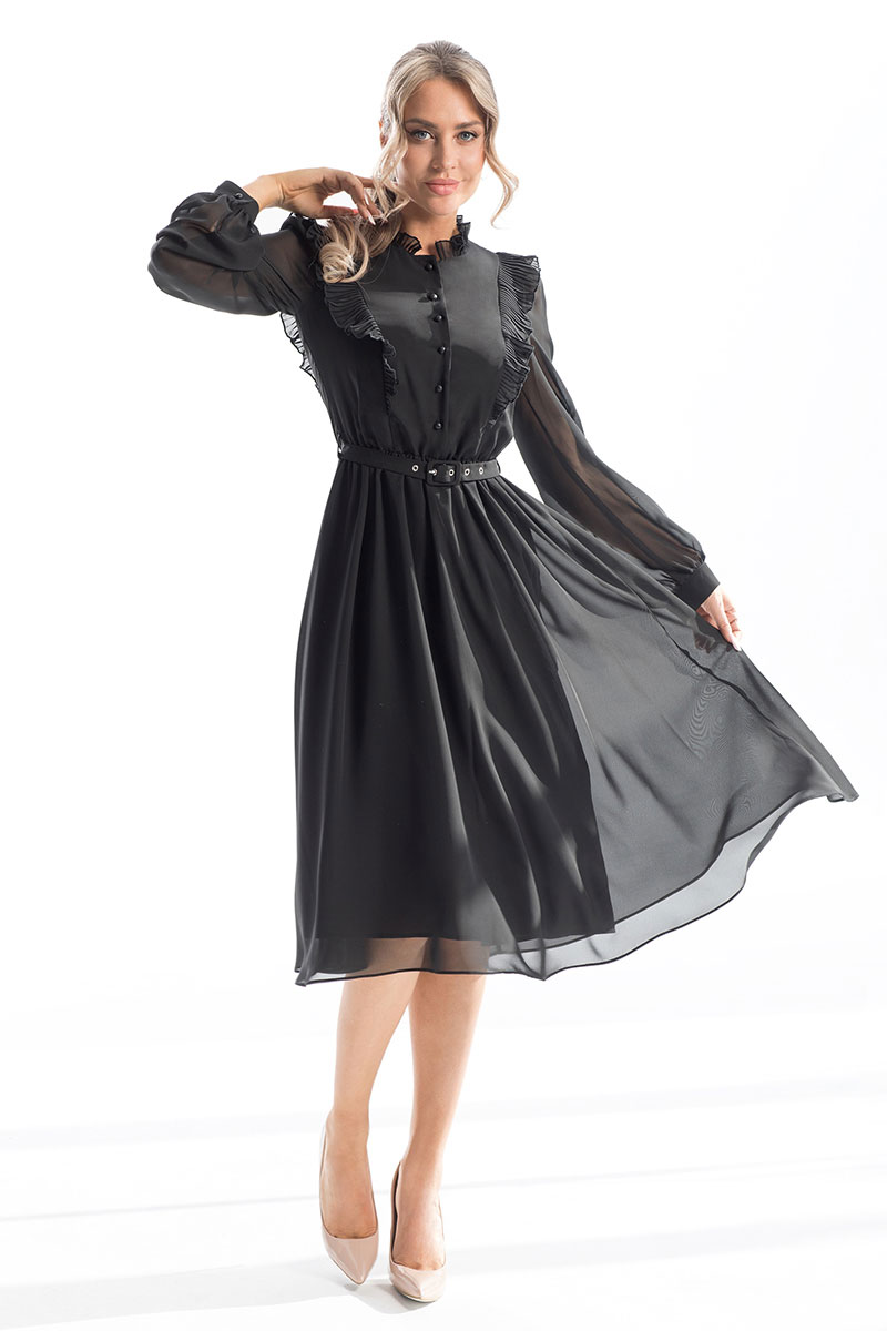 Платье, с воротником-стойкой, центральной застежкой на петли и пуговицы. Платье отрезное по линии талии. Шов по талии присборен на резинку. Верхняя часть переда с рельефами, выходящими из плеча, рюшей, выходящей из рельефов. Верхняя часть спинки с рельефами, выходящими из плеча и рюшей, выходящей из рельефов. Рукав втачной, длинный, с отрезной манжетой. По окату и шву притачивания манжеты рукав присборен. Платье со съемным поясом.