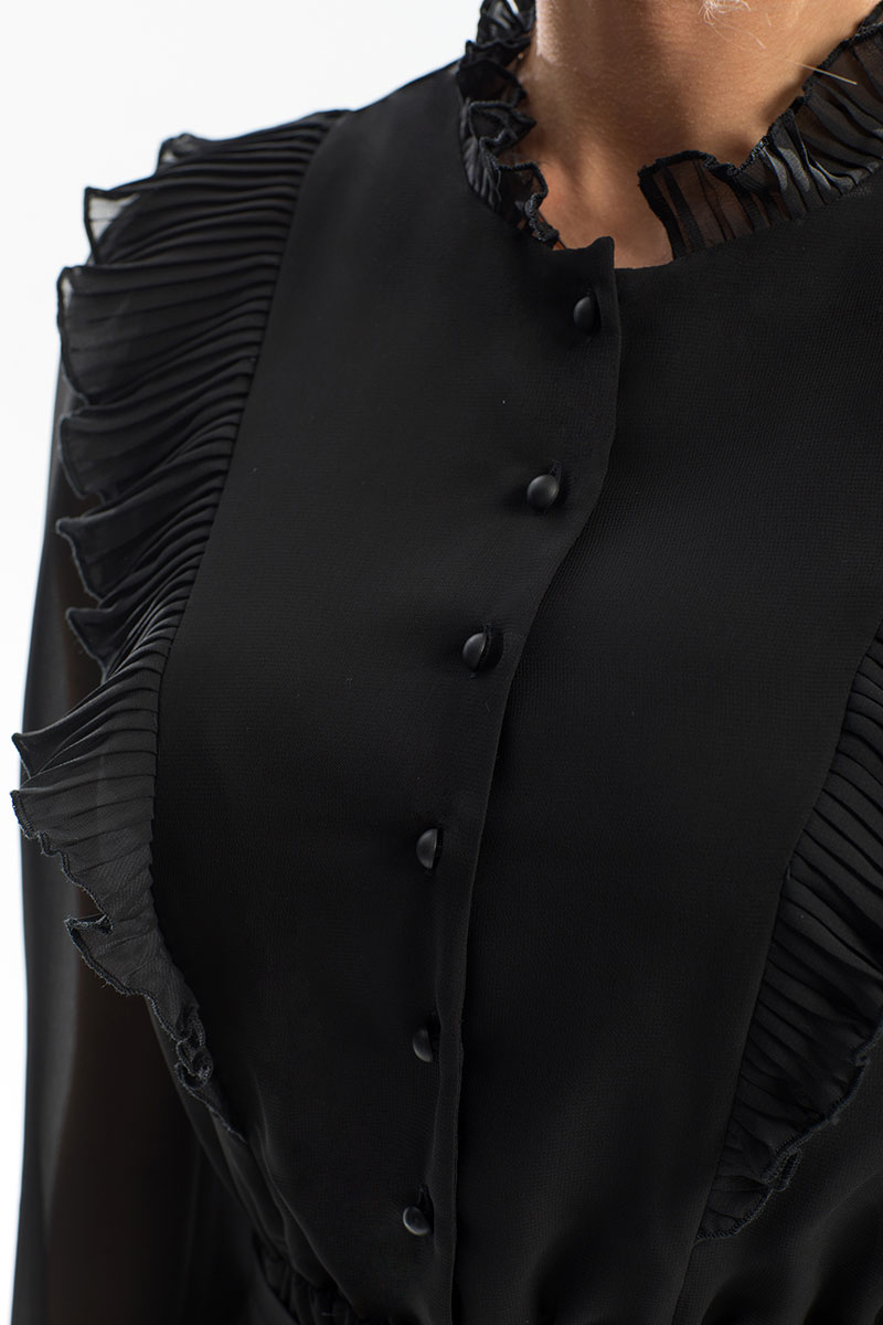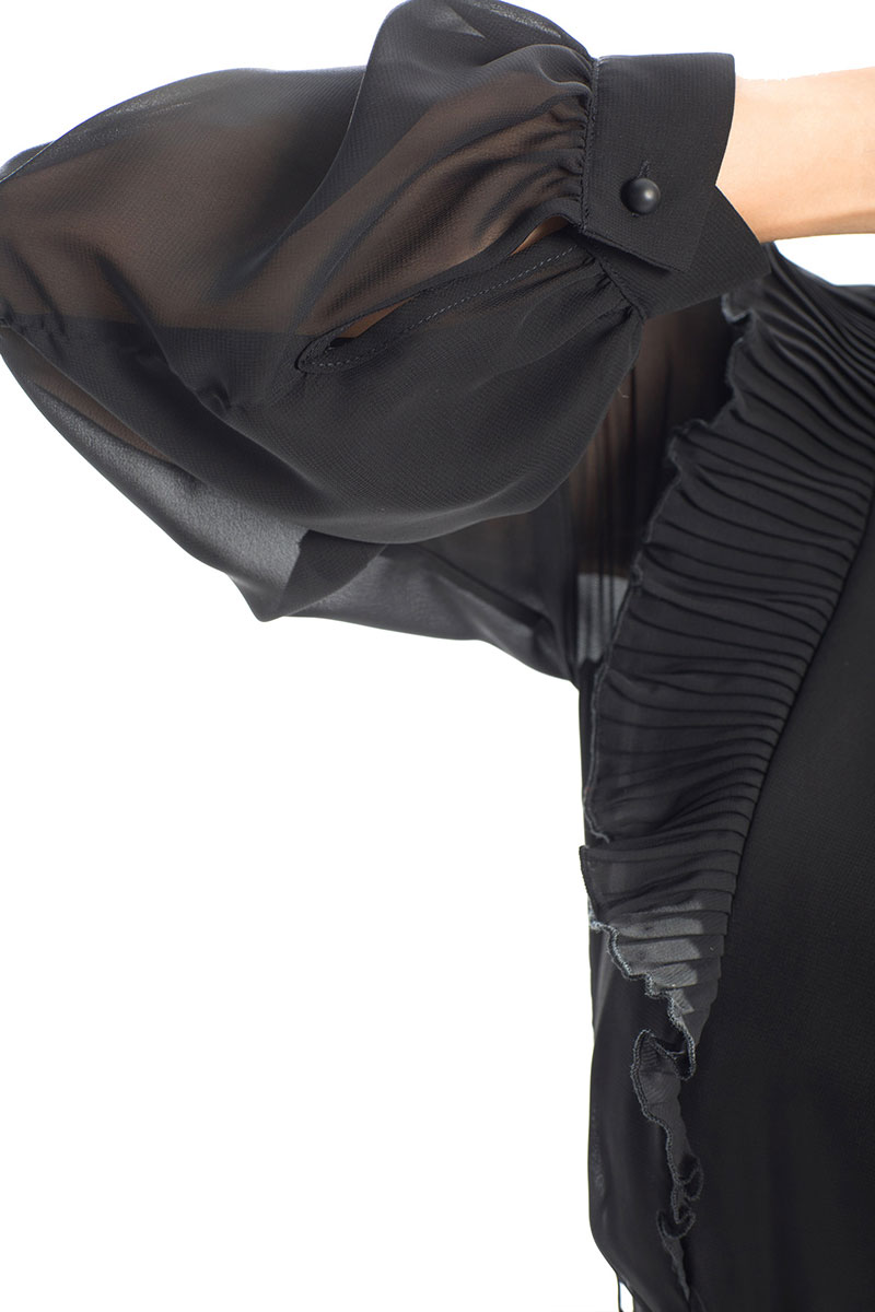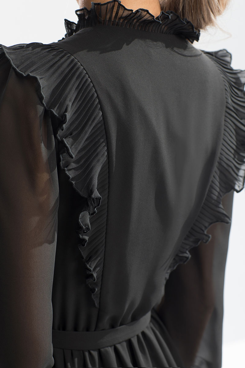 Цветовая гамма для верха, подкладки, фурнитуры, отделки: платье из ткани в одной цветовой гамме. Рюши и стойка из ткани плиссе, в тон основной ткани.