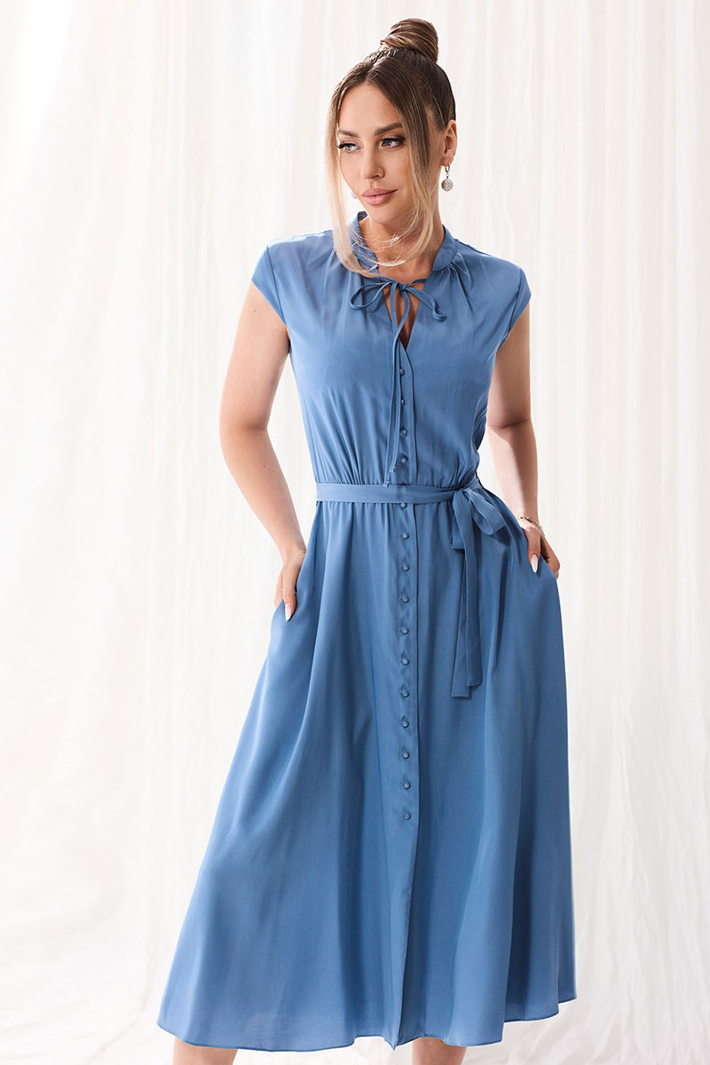 Платье с центральной застежкой на петли и пуговицы, с отрезным воротником- стойкой, рукав- крылышко. Платье отрезное по линии талии. Шов по талии присборен на резинку. По горловине переда- шнур- завязка. В боковых швах расположены карманы. Платье со съемным поясом.