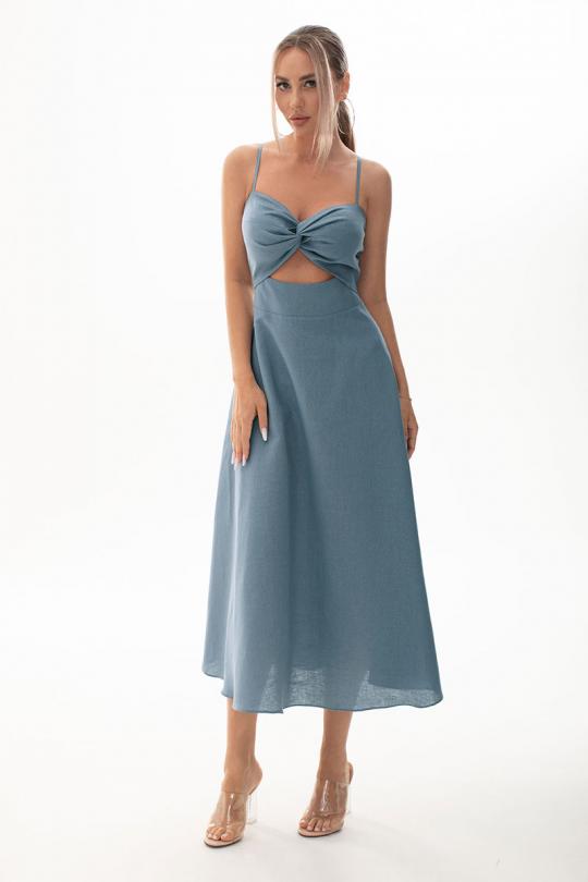 Платье на бретелях, без рукавов и воротника, с застежкой на потайную молнию в среднем шве спинки. Платье отрезное по линии талии. Лиф переда состоит из двух деталей, верхняя часть лифа с перекрученными деталями и отрезной нижней частью. Лиф спинки состоит из двух деталей, боковая деталь спинки присборена резинкой. Нижняя часть платья расклешенная.