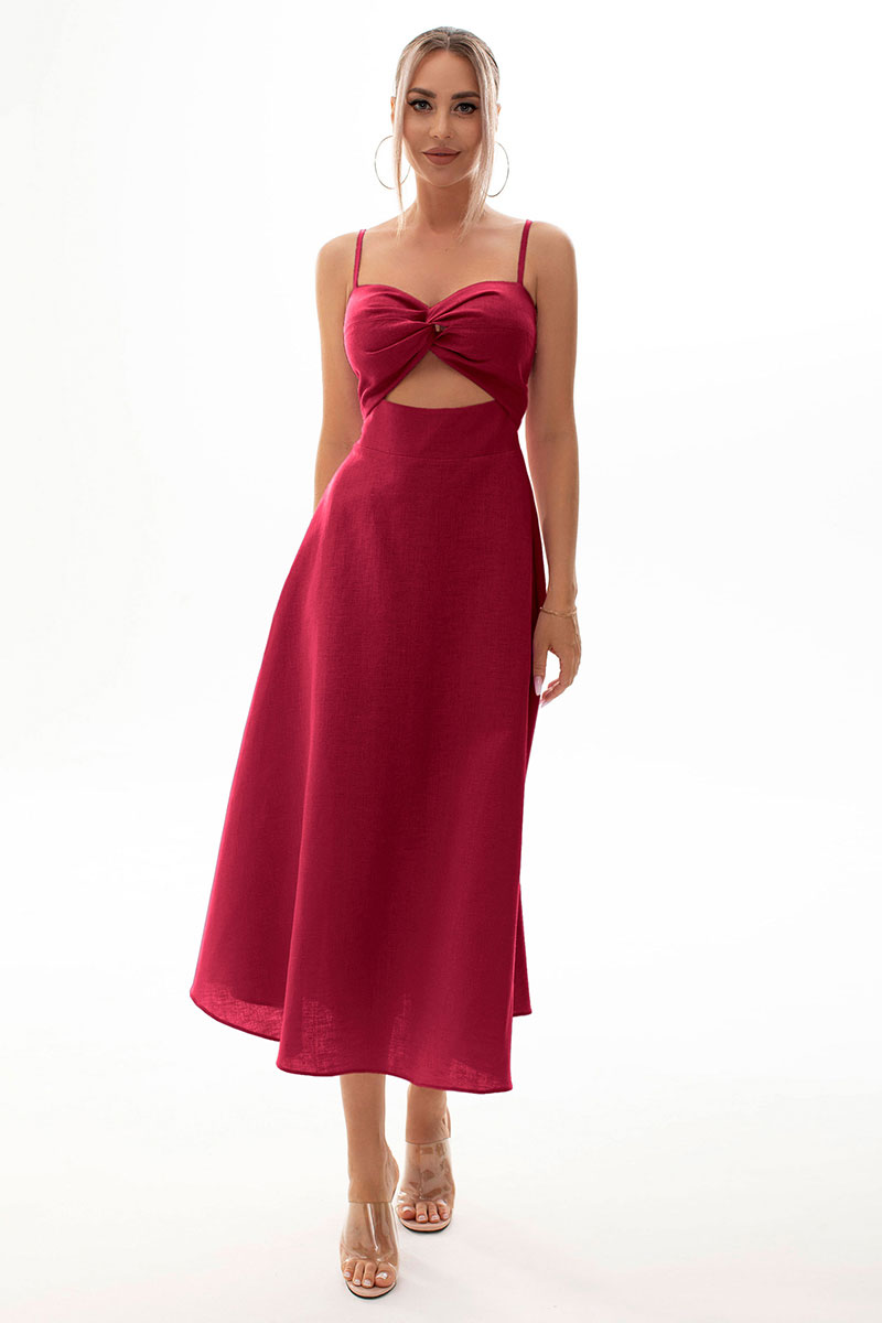 Платье на бретелях, без рукавов и воротника, с застежкой на потайную молнию в среднем шве спинки. Платье отрезное по линии талии. Лиф переда состоит из двух деталей, верхняя часть лифа с перекрученными деталями и отрезной нижней частью. Лиф спинки состоит из двух деталей, боковая деталь спинки присборена резинкой. Нижняя часть платья расклешенная.