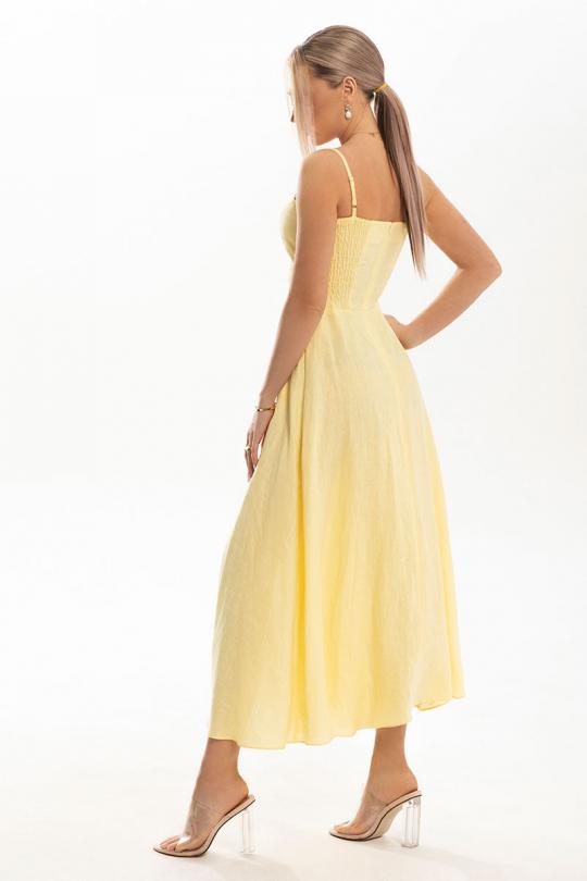 Платье на бретелях, без рукавов и воротника, с застежкой на потайную молнию в среднем шве спинки. Платье отрезное по линии талии. Лиф переда состоит из двух деталей, верхняя часть лифа с перекрученными деталями и отрезной нижней частью. Лиф спинки состоит из двух деталей, боковая деталь спинки присборена резинкой. Нижняя часть платья расклешенная.
