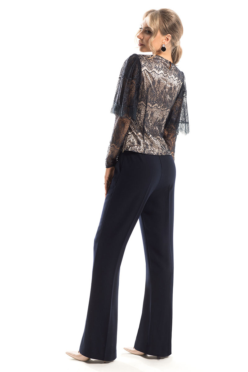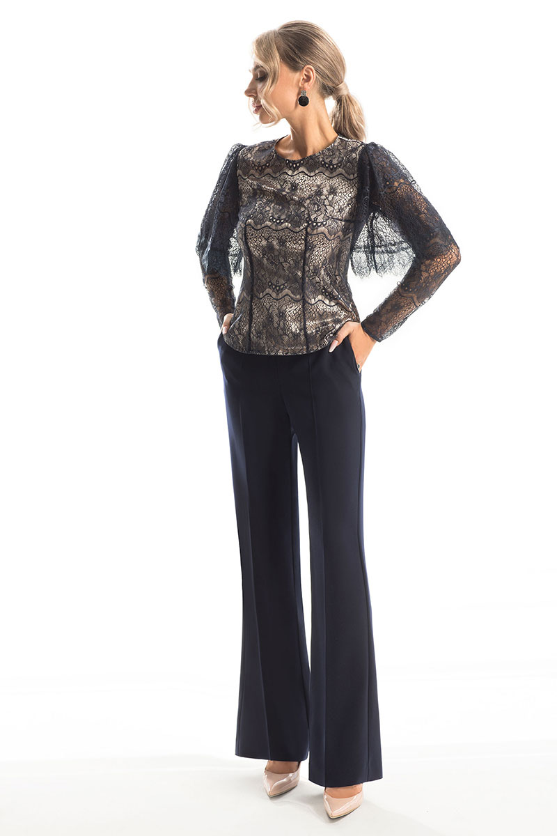 Цветовая гамма для верха, подкладки, фурнитуры, отделки: комплект выполнен из ткани в одной цветовой гамме. Блузка двухслойная, верхний слой из кружева, нижний слой из атласа, контрасного кружеву. Брюки в тон кружева блузки.
