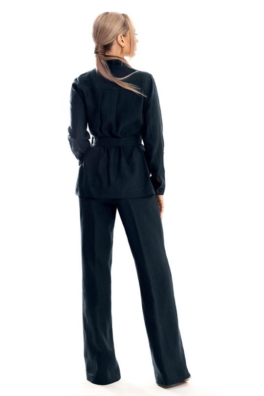 Жакет с центральной потайной застежкой на петли и пуговицу, втачным воротником-стойкой. По переду с накладными карманами с клапаном. Плечевой шов переходит на перед. Спинка с кокеткой, бантовой складкой по шву притачивания кокетки. Жакет со съемным поясом.