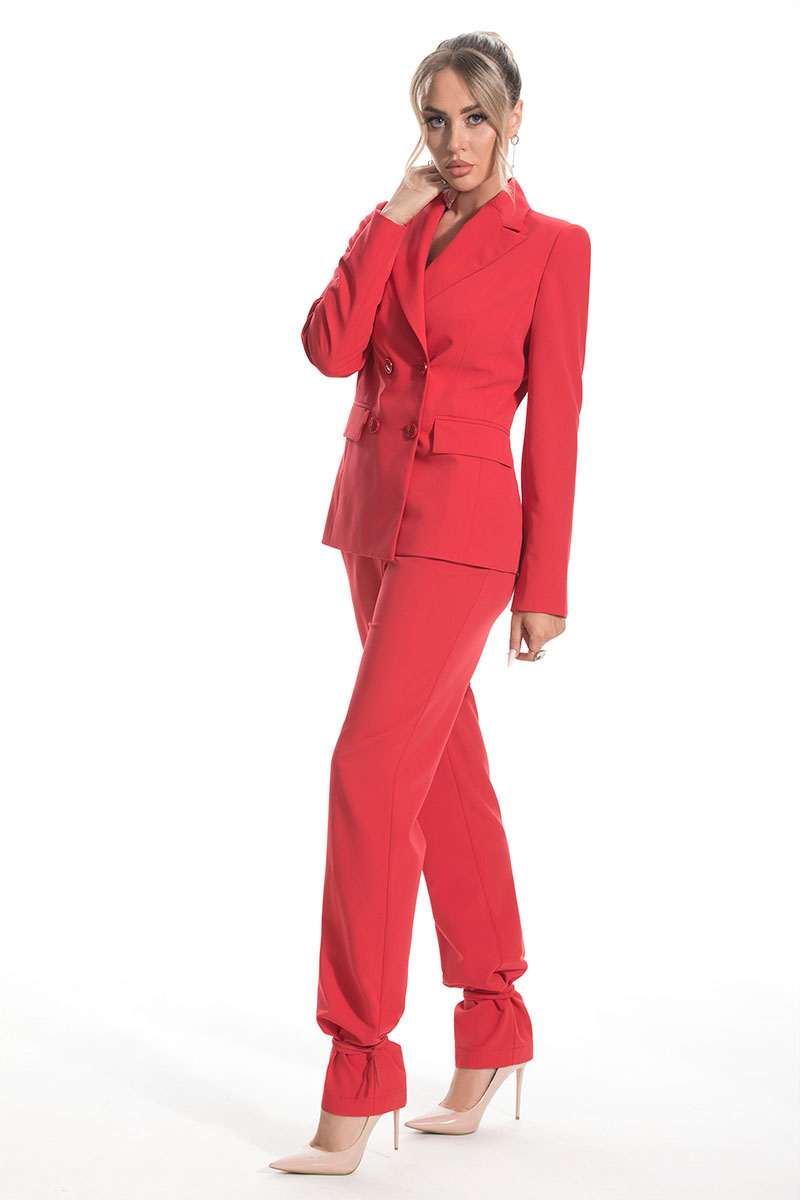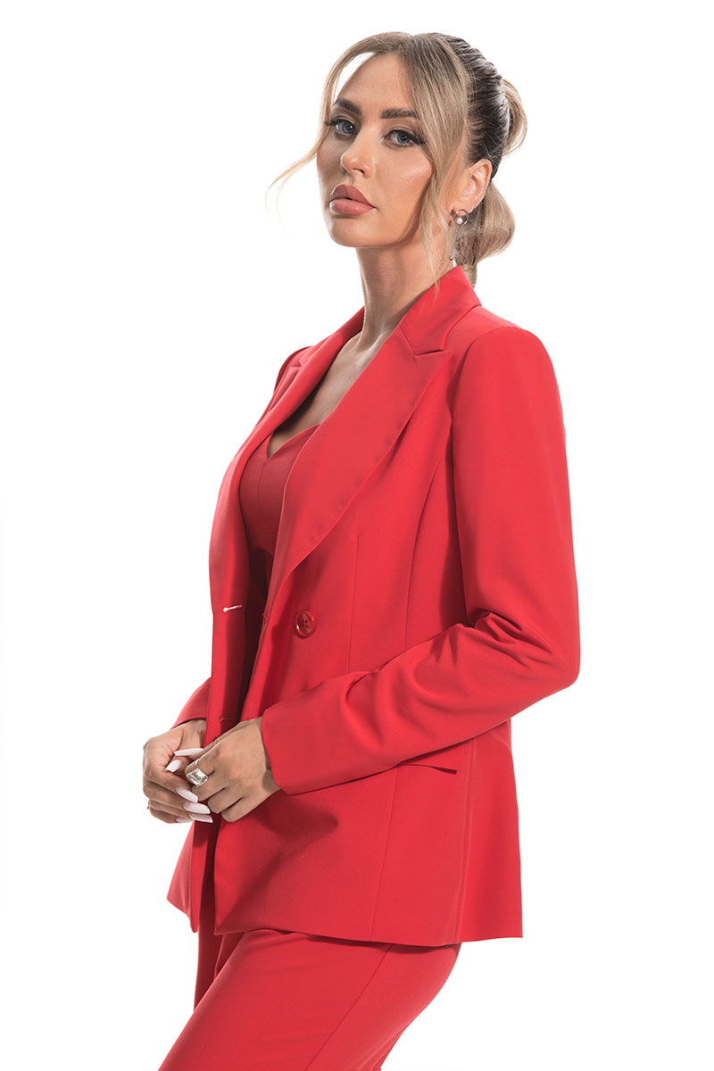 Жакет с центральной двубортной застежкой на петли и пуговицы, втачным воротником и отложными лацканами пиджачного типа. По переду с рельефами, выходящими из проймы, талиевыми вытачками, прорезными карманами с клапаном и двумя обтачками. Спинка со средним швом, рельефами, выходящими из проймы.