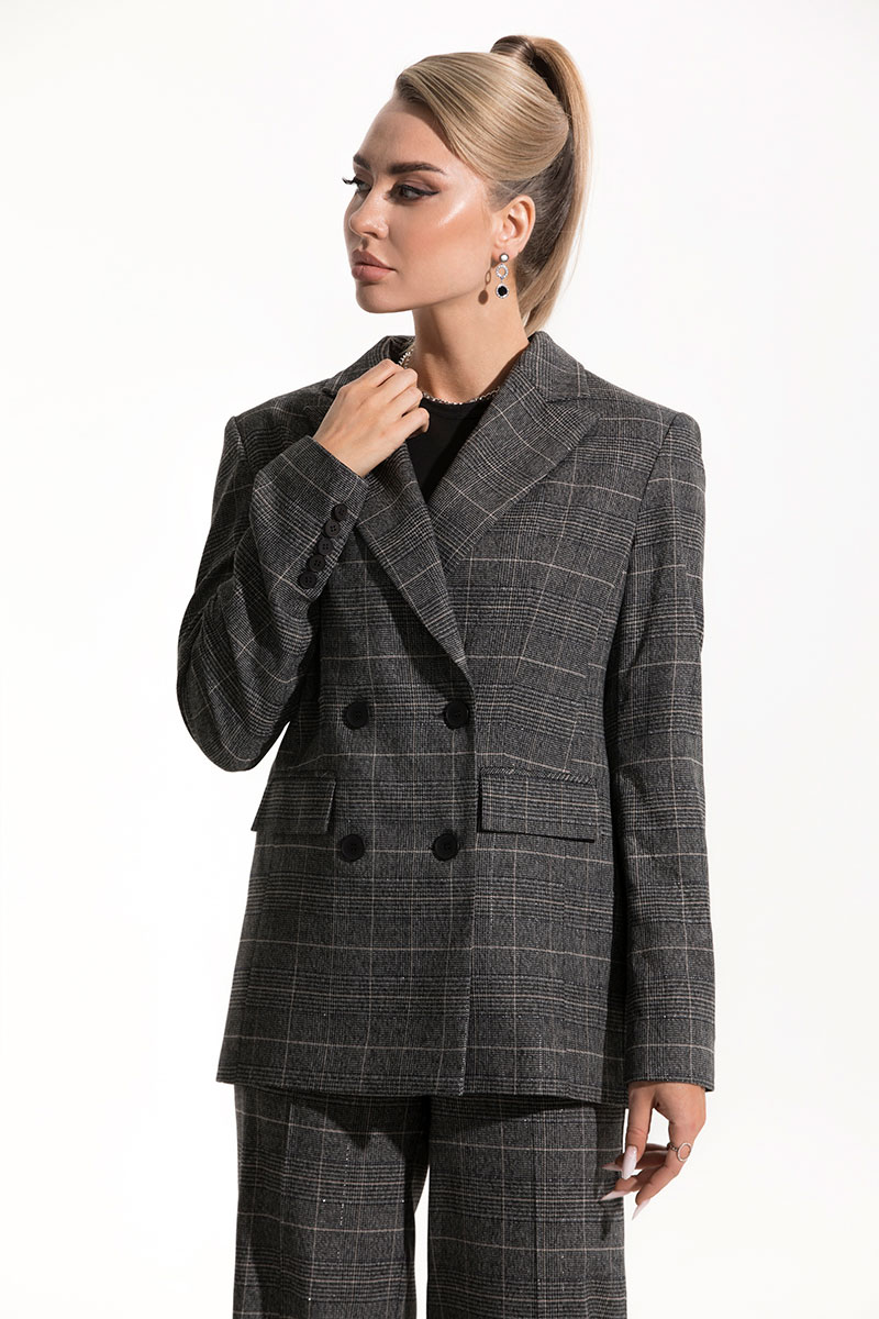 Жакет с центральной двубортной застежкой на петли и пуговицы, втачным воротником и отложными лацканами пиджачного типа. По переду с рельефами, выходящими из проймы, талиевыми вытачками, прорезными карманами с клапаном и двумя обтачками. Спинка со средним швом, рельефами, выходящими из проймы.