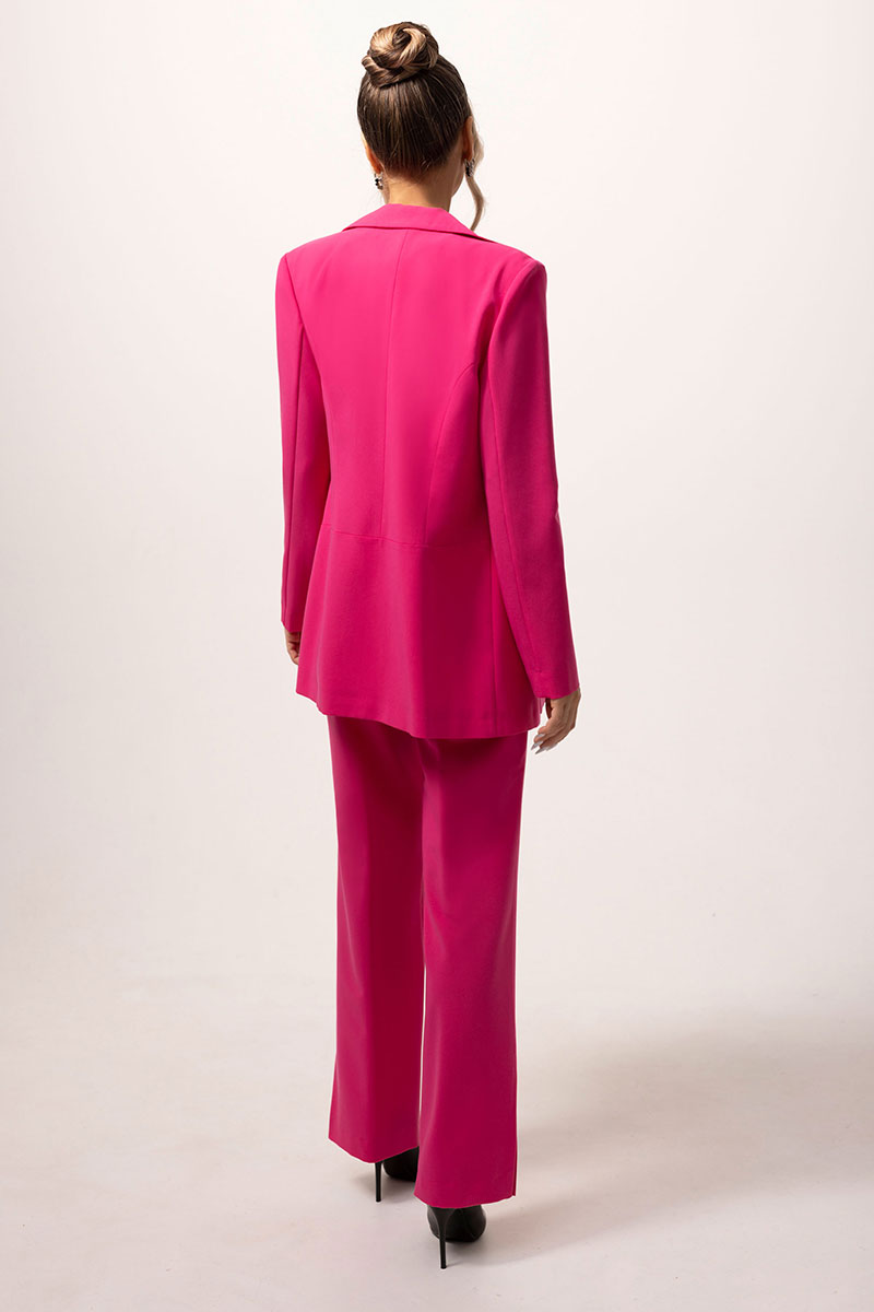 Жакет с центральной застежкой на петли и пуговицы, отложным воротником и лацканами пиджачного типа. Отрезной по линии талии. По переду с рельефами, выходящими из проймы, талиевыми вытачками, прорезными карманами с клапанами и двумя обтачками. Спинка со средним швом, рельефами, выходящими из проймы. Рукав втачной, длинный.