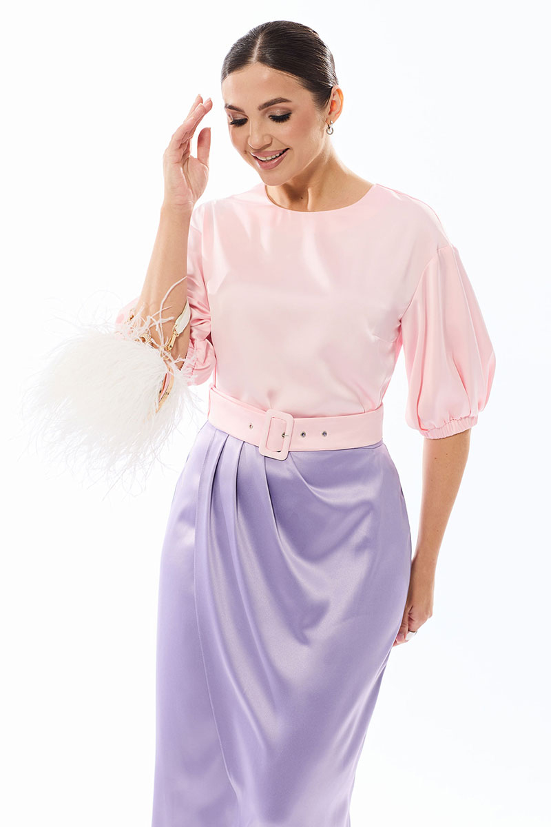 Блузка без воротника, с круглым вырезом горловины, застежкой на навесную петлю и пуговицу по среднему шву спинки. Перед с нагрудными вытачками. Спинка со средним швом. Рукав втачной, ¾, с отрезной манжетой. Манжета присборена на резинку. Блузка со съемным поясом.