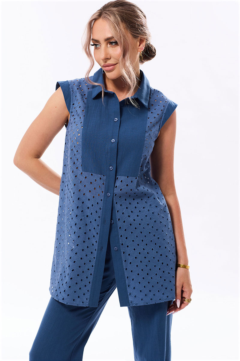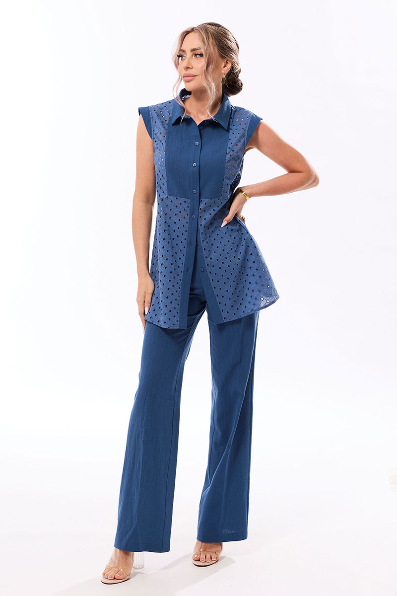 Цветовая гамма для верха, подкладки, фурнитуры, отделки: блузка выполнен из ткани- шитье с геометрическим рисунком, брюки выполнены из ткани в одной цветовой гамме.