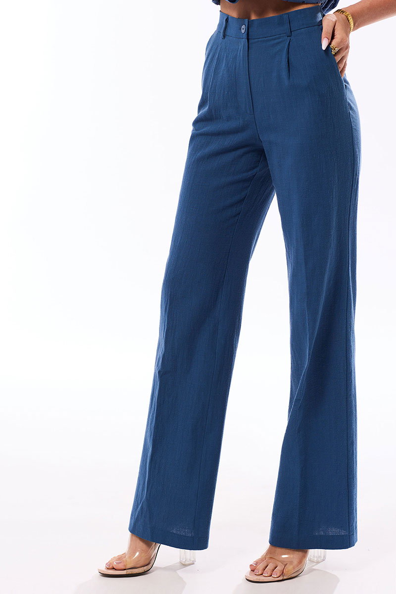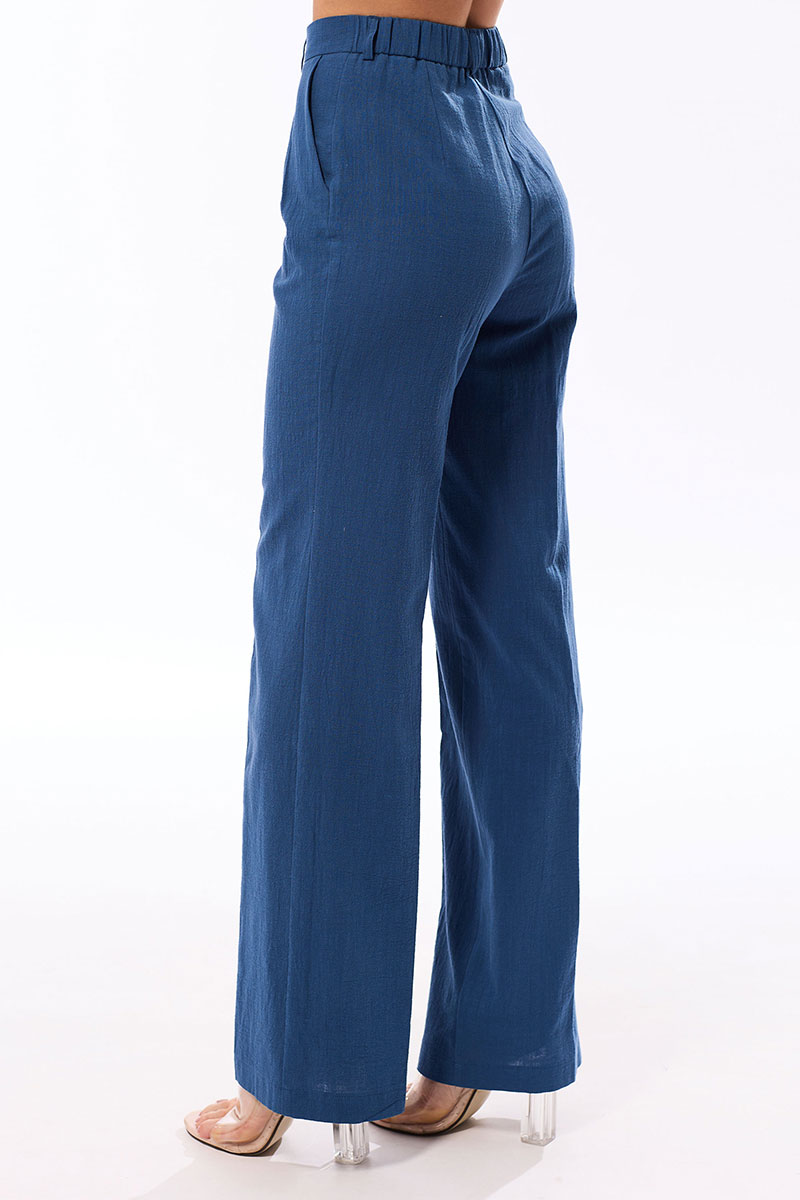 Брюки с отрезным поясом. Пояс присборен на резинку в области спинки. По боковым швам расположены карманы. Вход в карман наклонный к боковому шву. На передних половинках- односторонние складки.