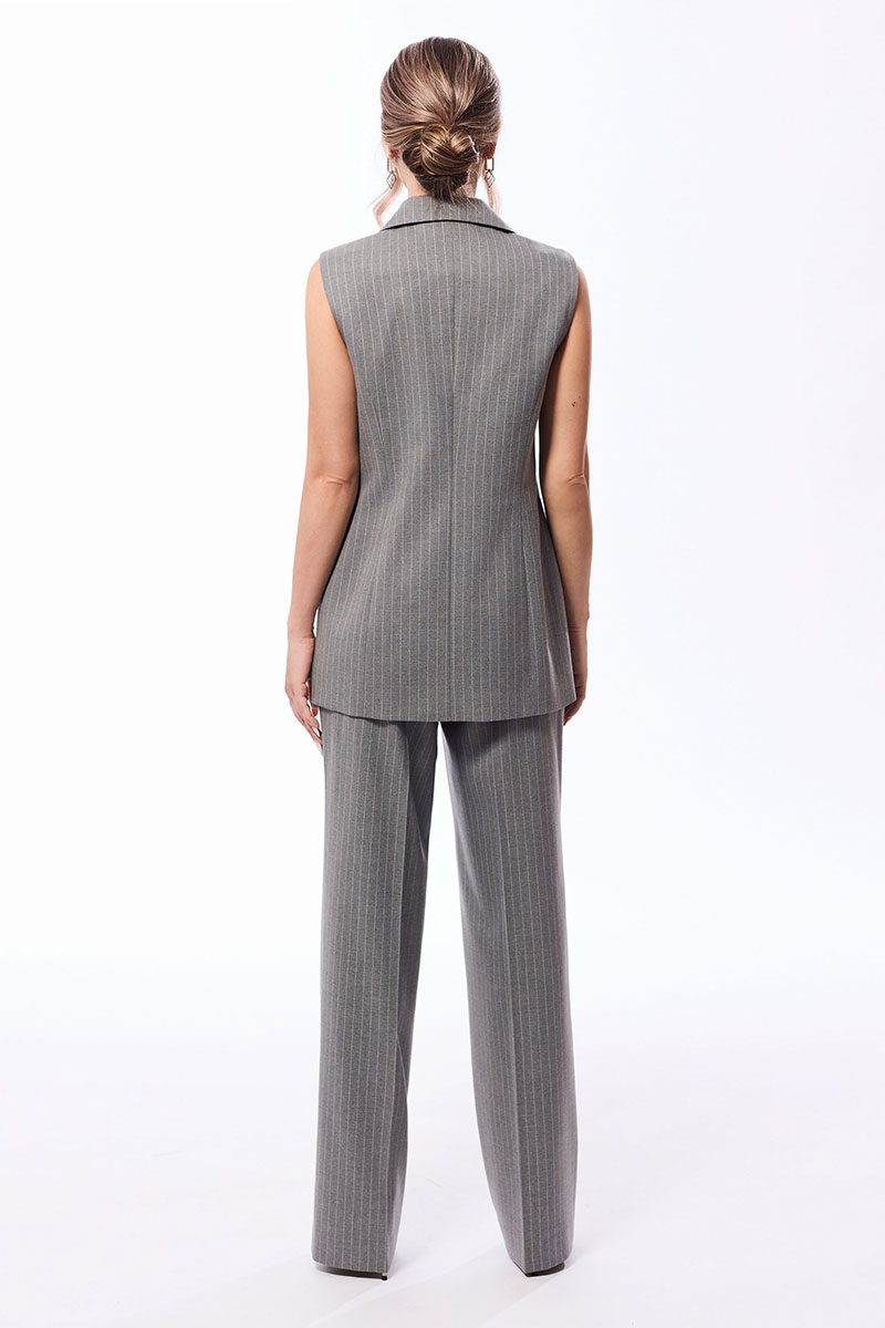 Жилет с втачным воротникои и отложными лацканами пиджачного типа, центральной застежкой на пришивные кнопки. По переду с рельефами, выходящими из проймы, талиевыми вытачками. На уровне линии бедер расположены прорезные карманы с клапаном и листочкой. Спинка со средним швом, рельефами, выходящими из проймы.