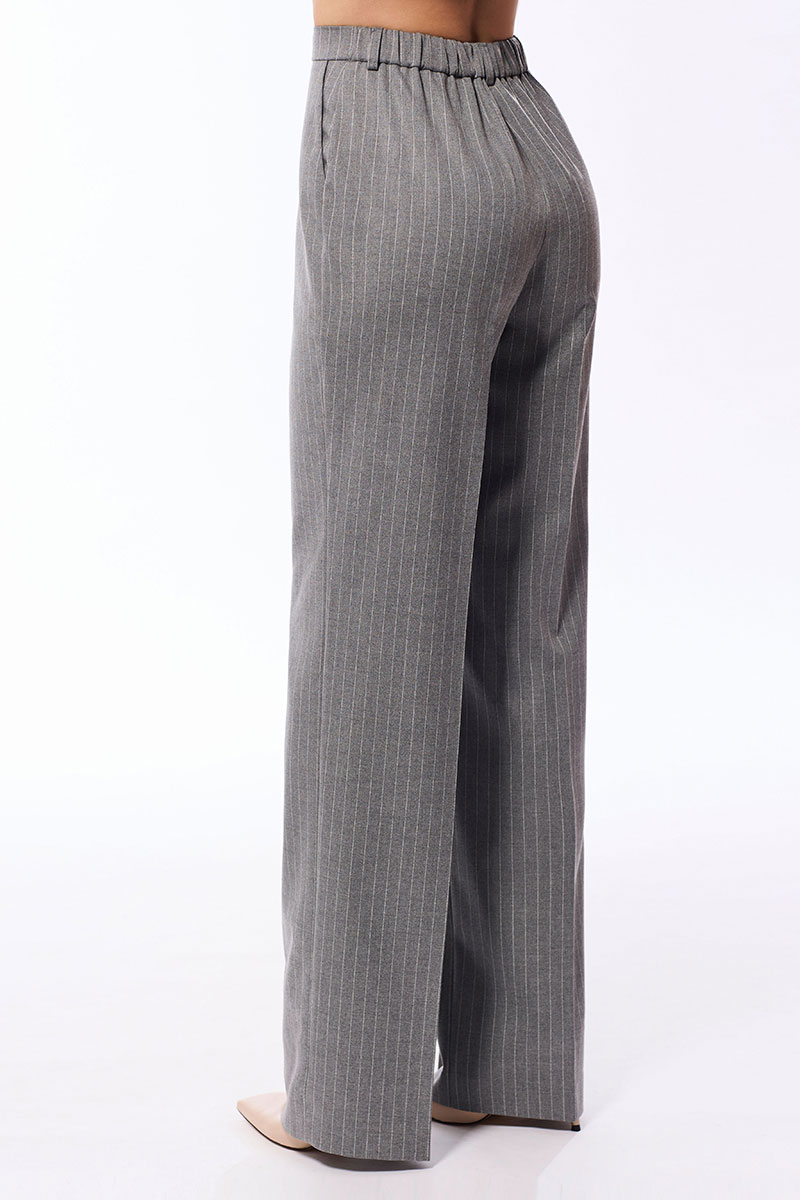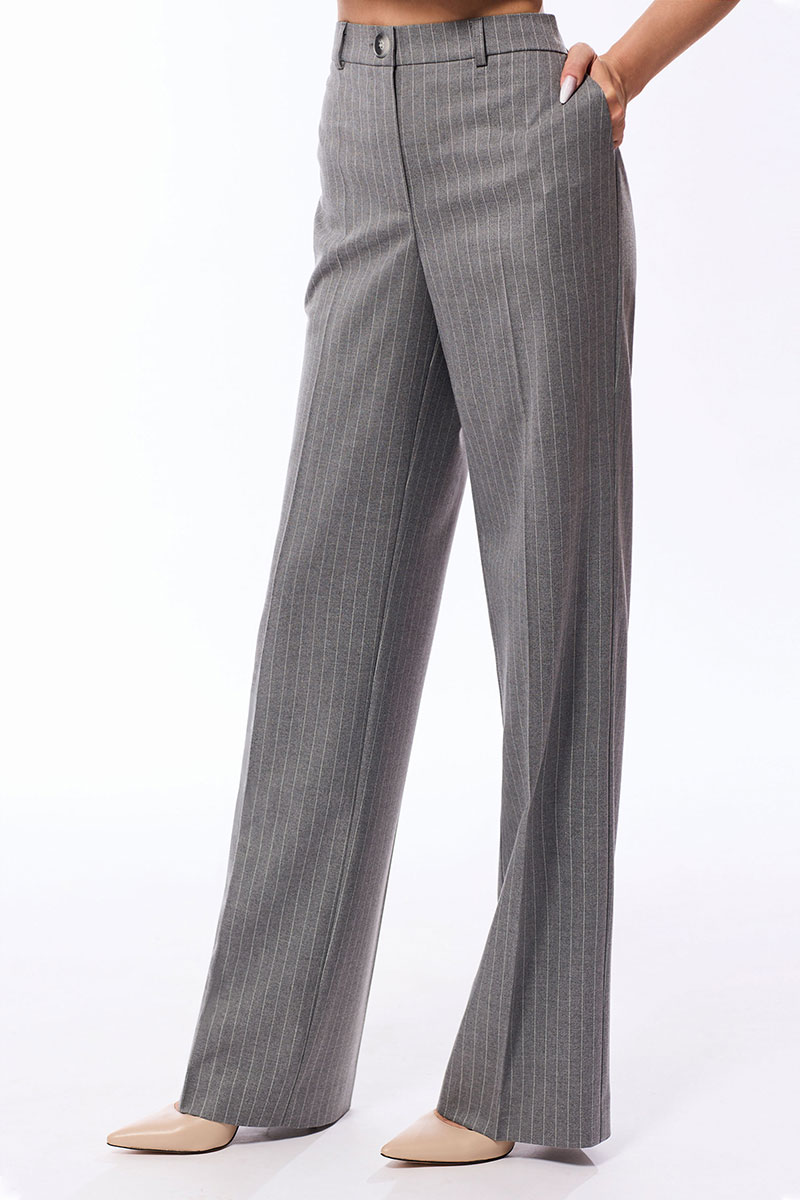 Брюки с отрезным поясом, застегивающимся на одну петлю и пуговицу. По спинке пояс присборен на резинку. В боковых швах расположены карманы. Вход в карман наклонный к боковому шву. Застежка гульфик.