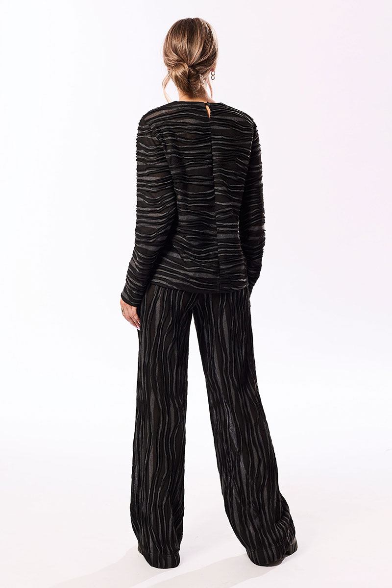 Блузон с застежкой на навесную петлю и пуговицу по горловине спинки, без воротника, с круглым вырезом горловины. По переду- кулиса со шнуром- завязкой. Спинка со средним швом. Рукав втачной, длинный.